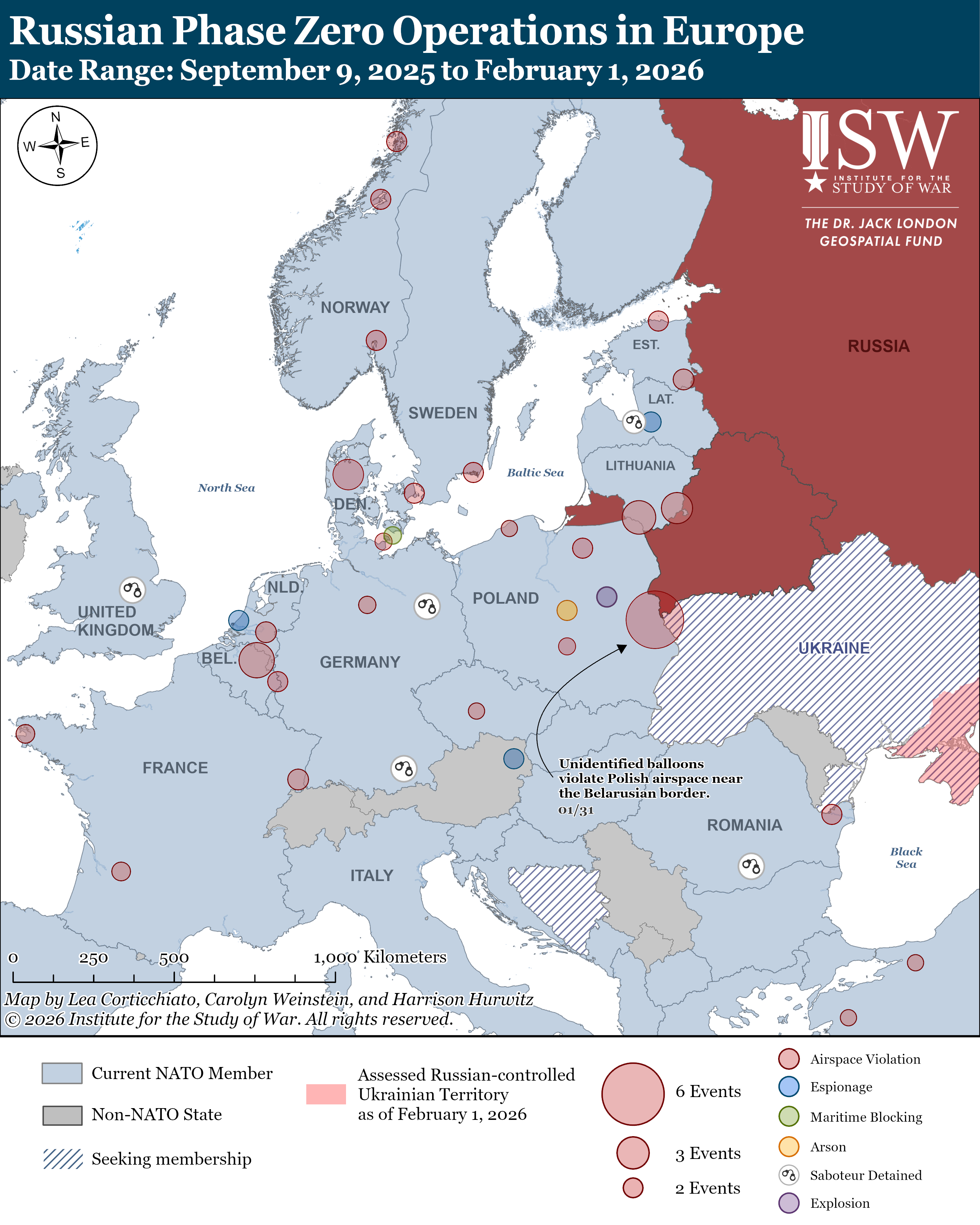 Belarus appears to be increasing the quantity and frequency of Belarusian balloon incursions into Polish and Lithuanian airspace. The Polish Armed Forces Operational Command reported that Belarus launched "balloon-like" objects into Polish airspace on the night of January 31 to February 1 and noted that the balloons aimed to reconnoiter and test Polish air defense reactions.[xxv] Belarus has launched balloon-like objects into Polish airspace three times in the last four days (since January 7), and Lithuania reported a record high of 42 Belarusian balloons in its airspace on the night of January 27 to 28.[xxvi] ISW continues to assess that Russia has de facto annexed Belarus, and Russia is likely using Russia is using airspace incursions of Poland and Lithuania from Belarus as part of its “Phase Zero” effort — the informational and psychological condition-setting phase — to prepare for a possible NATO-Russia war in the future.[xxvii]
