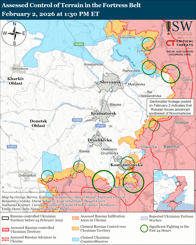 Assessed Russian infiltrations: Geolocated footage published on February 1 shows Ukrainian forces striking Russian servicemembers on a rural road east of Kostyantynivka after what ISW assesses was a Russian infiltration mission that did not change control of terrain or the forward edge of the battle area (FEBA) at this time.[63]