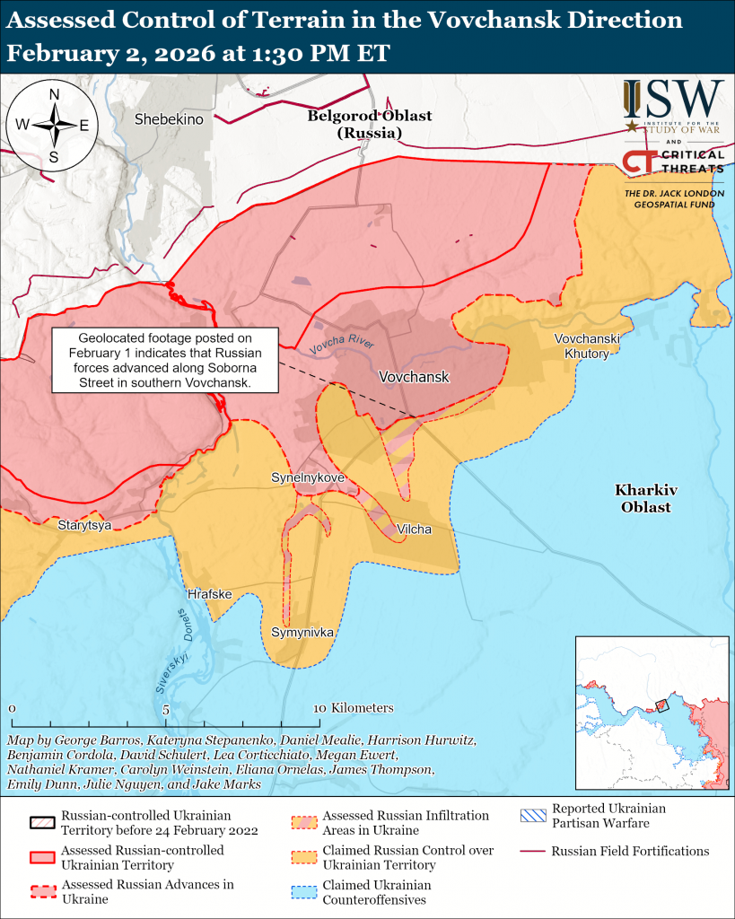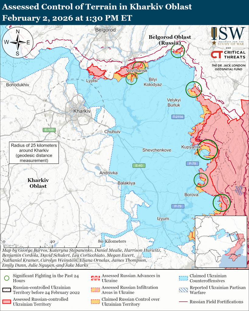 Russian forces continued offensive operations in the Velykyi Burluk direction on February 2 but did not make confirmed advances.