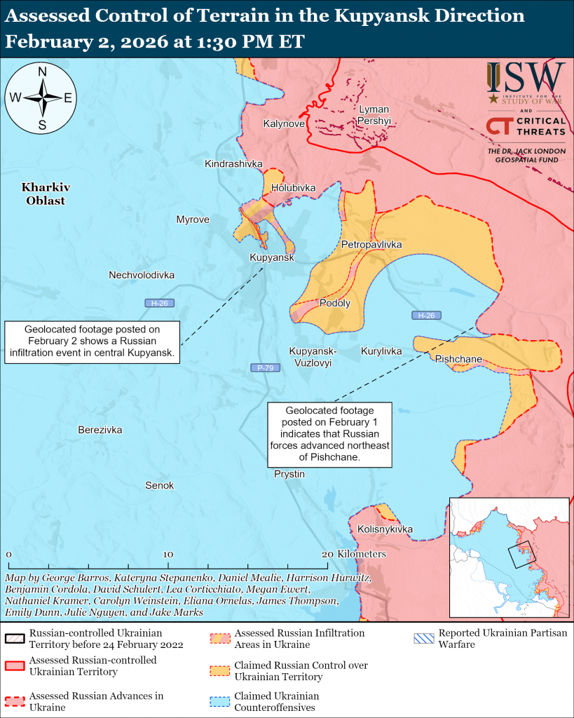 Assessed Russian infiltrations: Geolocated footage published on February 1 shows Ukrainian forces striking Russian positions in central Kupyansk after what ISW assesses was a Russian infiltration mission that did not change control of terrain or the forward edge of battle area (FEBA) at this time.[46] ISW cannot verify the likely route that Russian forces took in central Kupyansk.