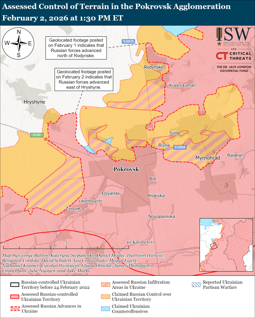 Assessed Russian advances: Geolocated footage published on February 1 and 2 indicates that Russian forces recently advanced east of Hryshyne (northwest of Pokrovsk) and northwest of Rodynske (north of Pokrovsk).[72]