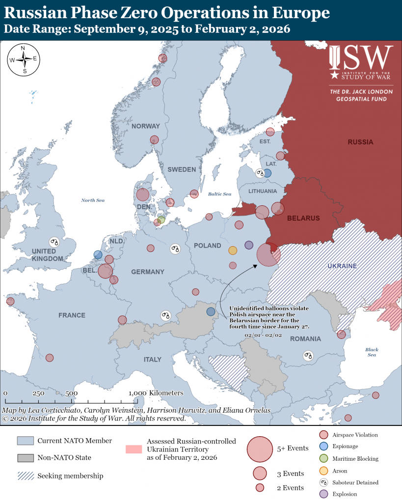 Belarus continues to increase the frequency of its balloon incursions into Polish airspace. The Polish Armed Forces Operational Command reported that Polish radar systems recorded the incursion of “balloon-like objects” into Polish airspace on the night of February 1 to 2.[29] The Polish Armed Forces Operational Command noted that there were fewer balloon violations than on previous nights. Belarus has launched balloon-like objects into Polish airspace four times in five days (since January 27).[30] ISW continues to assess that Russia has de facto annexed Belarus and that Russia is likely using airspace incursions into NATO states like Lithuania and Poland from Belarus as part of its “Phase Zero” effort — the informational and psychological condition-setting phase — to prepare for a possible NATO-Russia war in the future.[31]