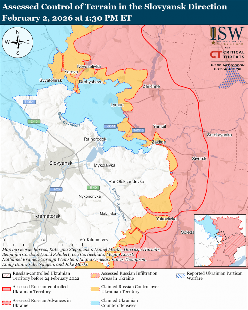 Russian forces continue efforts to seize Lyman and subsequently launch an offensive on Slovyansk, but likely do not have the offensive capability to do so in the short-term, in part due to Ukrainian counterattacks in the Kupyansk direction. Ukrainian military observer Kostyantyn Mashovets reported on February 2 that the main objective of the Russian Western Grouping of Forces in the Lyman direction is to reach the Slovyansk-Kramatorsk agglomeration from the northeast, and that the Russian military command hopes to begin this offensive in May or June 2026.[16] Mashovets reported that Russian forces - namely elements of the 20th Combined Arms Army (CAA, Moscow Military District [MMD]), 25th CAA (Central Military District [CMD]), and the 2nd Motorized Rifle Division (1st Guards Tank Army [GTA], MMD) -- must first seize Lyman and push Ukrainian forces from the north (left) bank of the Siverskyi Donets River in the area. Mashovets assessed that the Russian military command aims to do so by mid-to-late Spring 2026. Mashovets stated that the current Russian offensive operations, including attacks with elements of the 25th CAA from the northwest and with elements of the 20th CAA from the east and northeast, aim to establish favorable positions for a future effort to envelop Lyman.