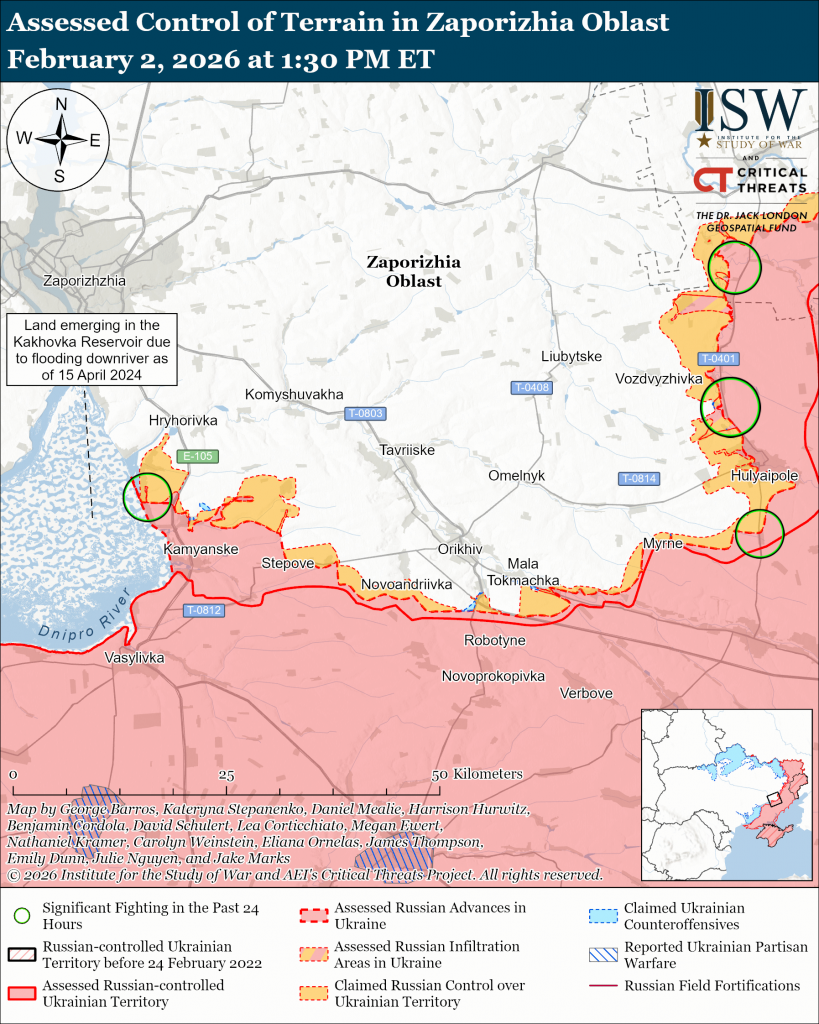 Assessed Russian infiltrations: Geolocated footage published on February 2 shows two Russian servicemembers raising flags in Prydorozhnie (northwest of Hulyaipole) during what ISW assesses was a Russian infiltration mission that did not change the control of terrain or the forward edge of the battle area (FEBA) at this time.[82]
