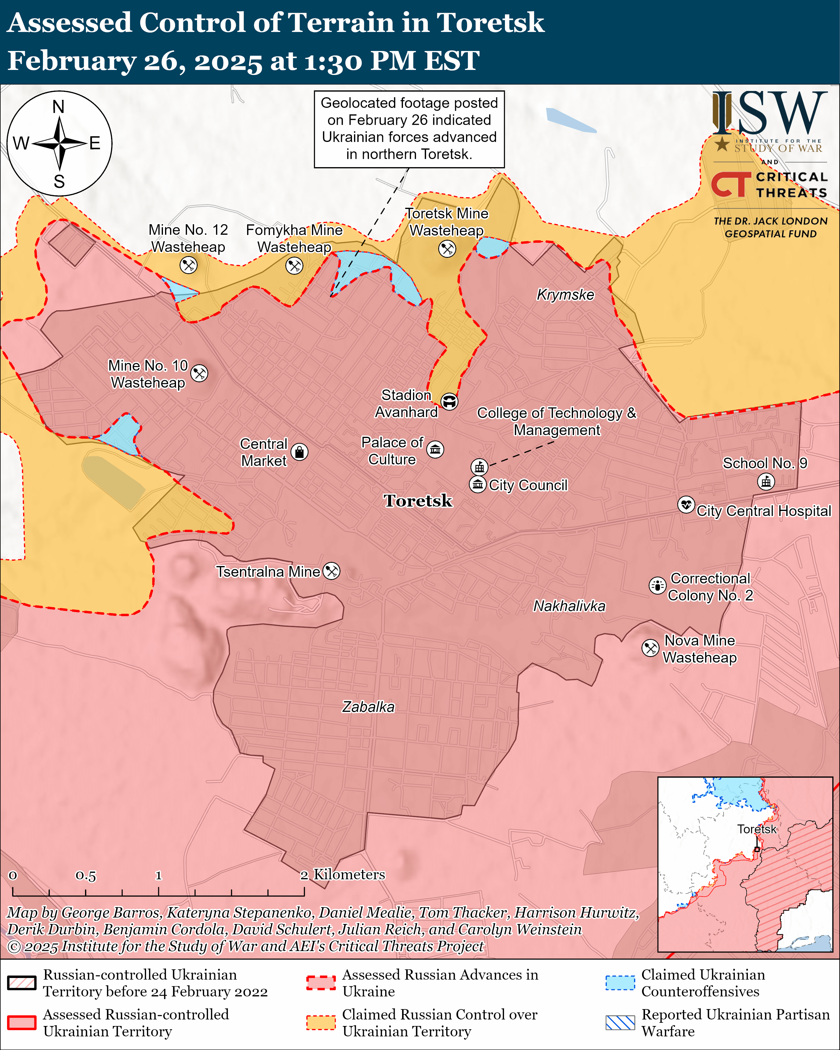 Assessed Ukrainian advances: Geolocated footage published on February 26 indicates that Ukrainian forces recently advanced along Chaikovoskoho and Karla Libknekhta streets in northern Toretsk.[xli]