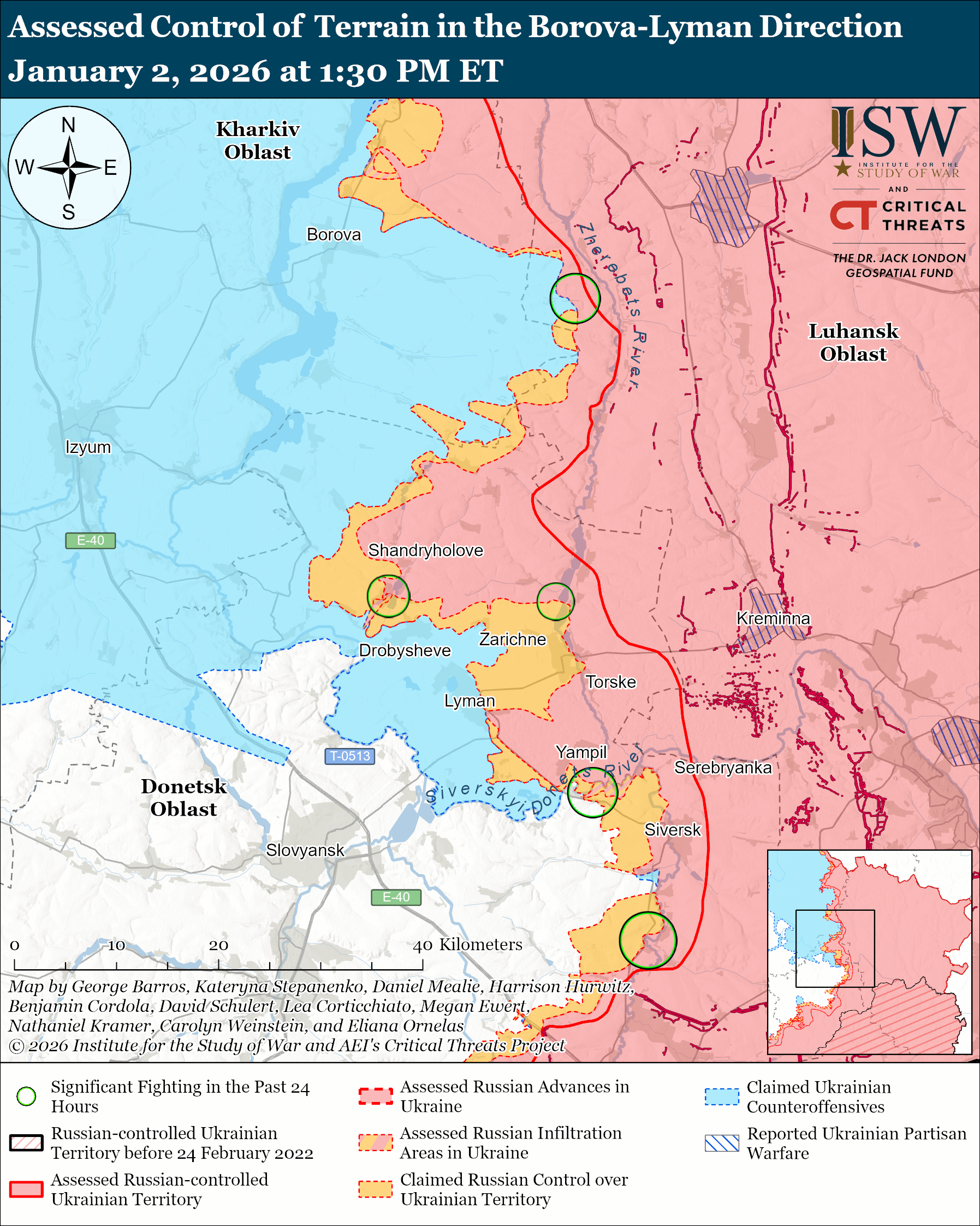 Russian forces attacked near Siversk itself; northwest of Siversk near Yampil and Zakitne; northeast of Siversk near Serebryanka; south of Siversk near Pereizne; and southwest of Siversk near Riznykivka and Sakko i Vantsetti on December 31 and January 1 to 2.[lxxi]