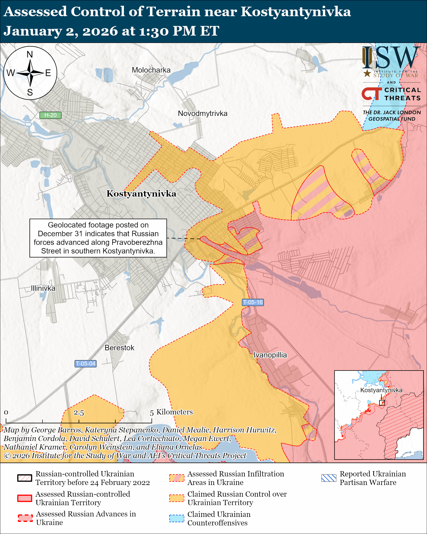 Assessed Russian infiltrations: Geolocated footage published on January 1 shows Ukrainian forces striking a Russian servicemember north of Predtechyne (east of Kostyantynivka).[lxxvi] Additional geolocated footage published on January 2 shows Russian servicemembers raising a Russian flag in central Mayske (northeast of Kostyantynivka).[lxxvii] ISW assesses that these were Russian infiltration missions that did not change control of terrain or the forward edge of the battle area (FEBA) in these areas.