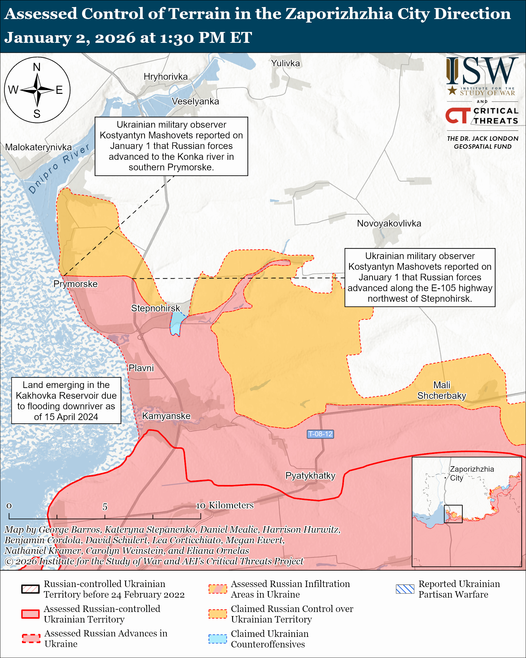 Assessed Russian advances: Ukrainian military observer Kostyantyn Mashovets and a source reportedly affiliated with Ukrainian military intelligence reported on December 31 and January 1 that Russian forces bypassed Stepnohirsk (west of Orikhiv) to the west along the road to Hryhorivka (north of Stepnohirsk) and to the east along the road to Lukyanivske (northeast of Stepnohirsk).[cxviii] Mashovets reported that Russian forces reached the Ukrainian defensive line along the Konka River near Prymorske (west of Orikhiv).[cxix] Russian and Ukrainian sources indicated that Russian forces have not yet seized Stepnohirsk or Prymorske, however.[cxx]