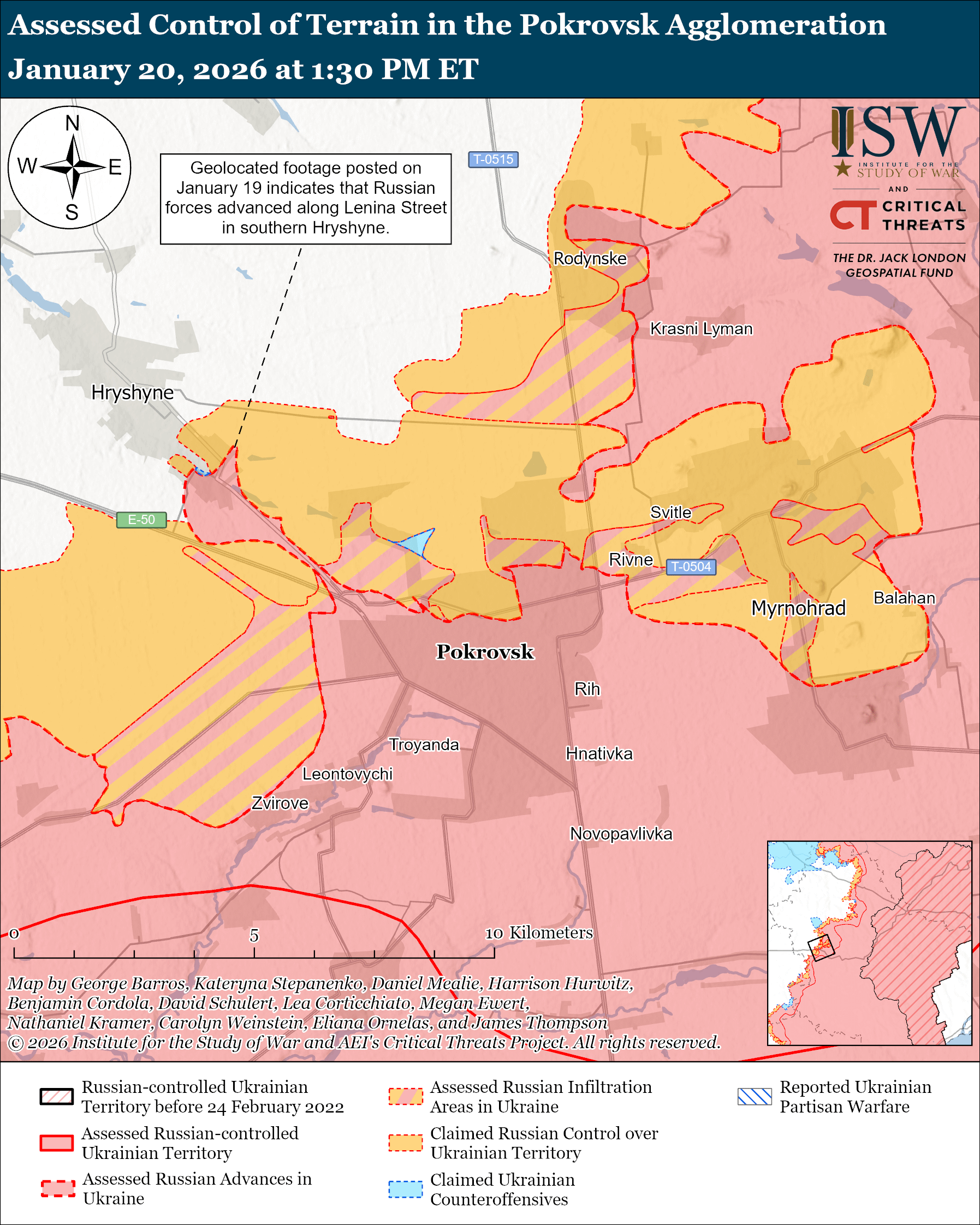 Russian forces attacked near and within Pokrovsk itself; north of Pokrovsk near Bilytske and Rodynske; northeast of Pokrovsk near Chervonyi (Krasnyi) Lyman; east of Pokrovsk near Myrnohrad; southwest of Pokrovsk near Kotlyne, Udachne, and Molodetske; and northwest of Pokrovsk near Hryshyne on January 19 and 20.[80]