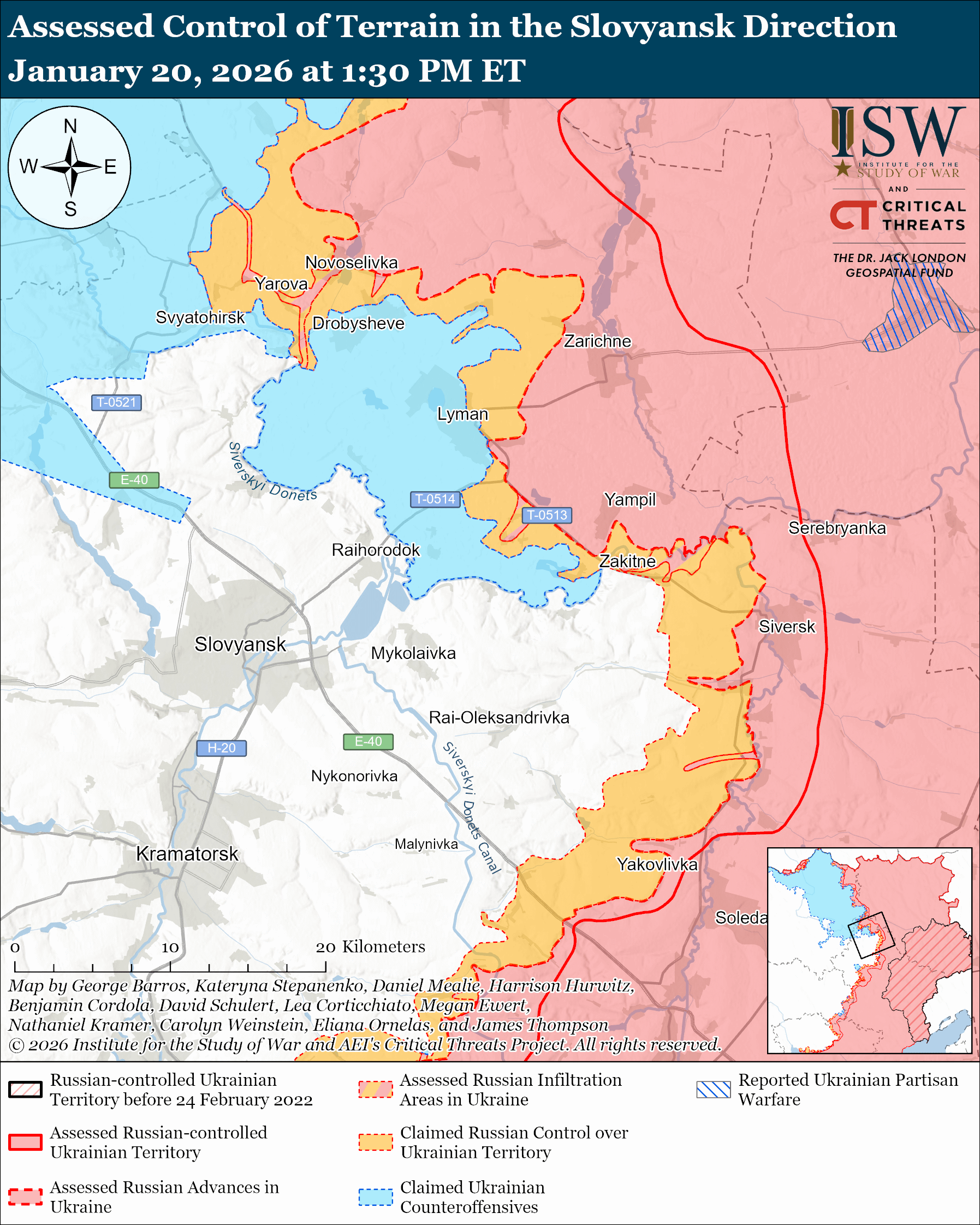 Russian forces attacked northwest of Lyman near Novoselivka; northeast of Lyman near Kolodyazi and Zarichne; southeast of Lyman near Dibrova and Ozerne; northeast of Slovyansk near Dronivka and Platonivka; and southeast of Slovyansk near Bondarne on January 19 and 20.[63]