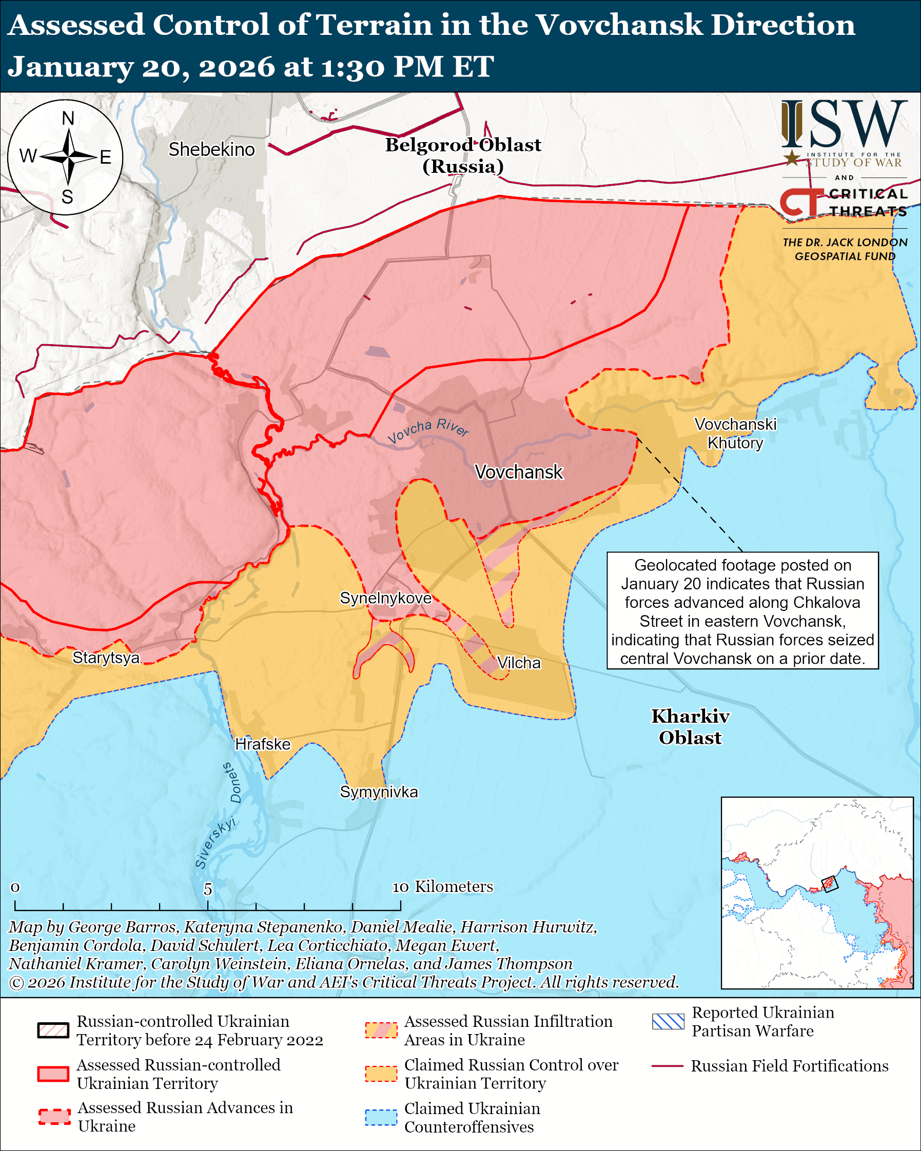 Assessed Russian advances: Geolocated footage published on January 20 indicates that Russian forces recently advanced in eastern Vovchansk (northeast of Kharkiv City).[49] Available video evidence indicates that Russian forces also advanced in southeastern and eastern Vovchansk and that the Russian forward edge of the battle area (FEBA) in Vovchansk is further southeast than ISW previously assessed.[50]