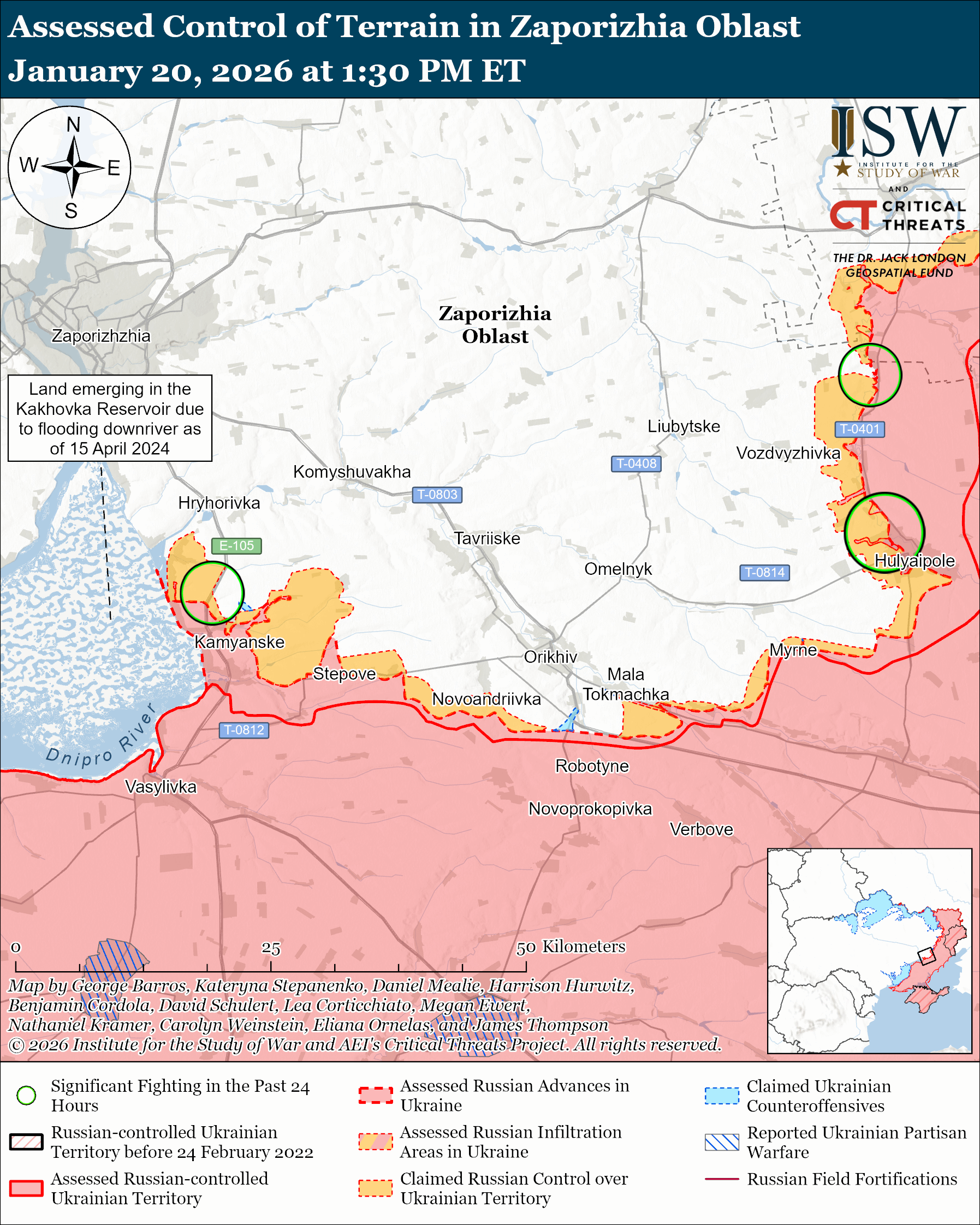 Russian forces continued offensive operations in western Zaporizhia Oblast on January 20 but did not make confirmed advances.