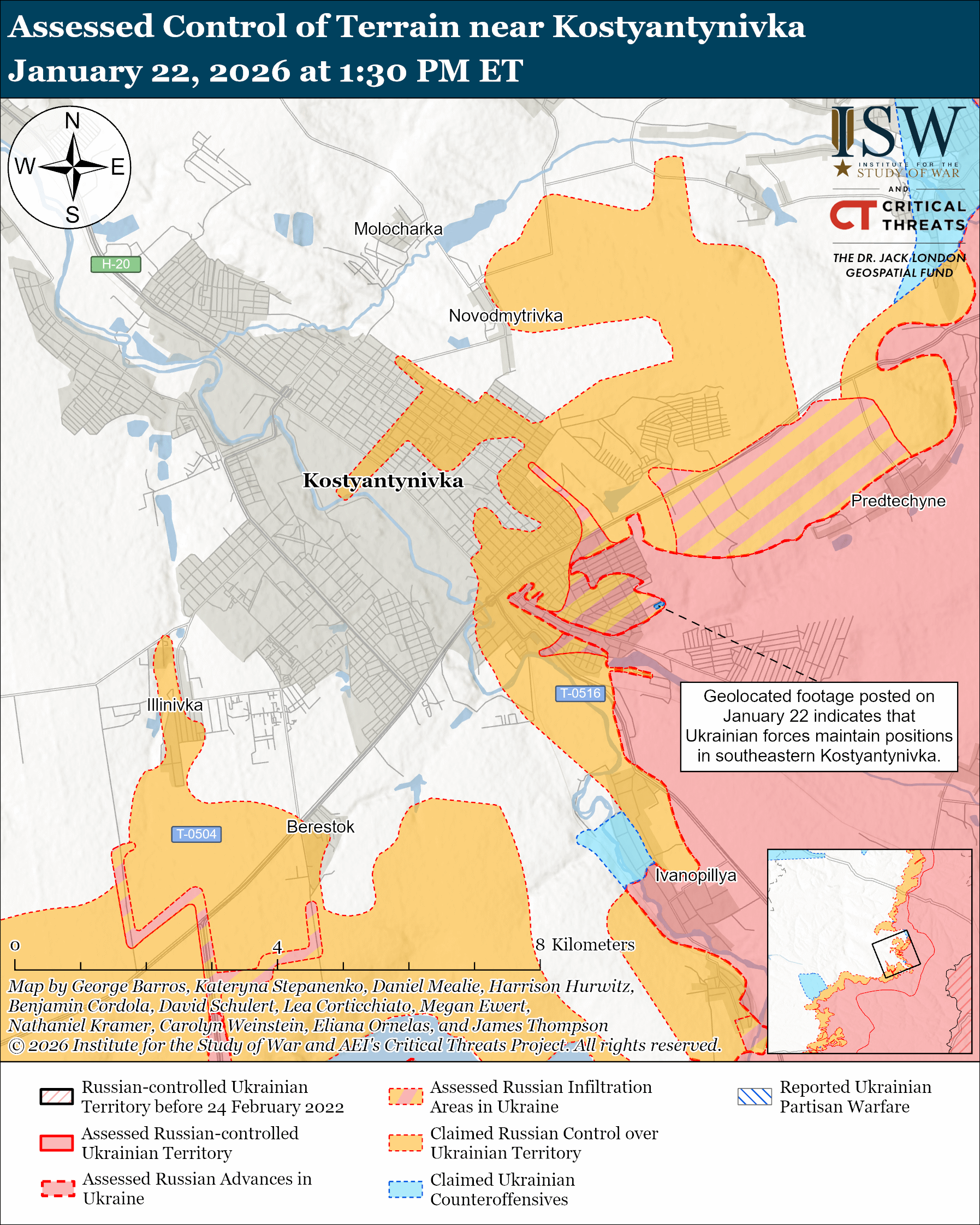 Assessed Ukrainian advances: Geolocated footage published on January 22 indicates that Ukrainian forces recently advanced in southeastern Kostyantynivka.[liv] ISW cannot independently verify the likely route of Ukrainian forces to southeastern Kostyantynivka. The geolocated footage also indicates that Ukrainian forces maintain strongpoints that Russian forces bypassed using infiltration tactics in southeastern Kostyantynivka and may not have lost control of an area that ISW previously assessed that Russian forces advanced in.