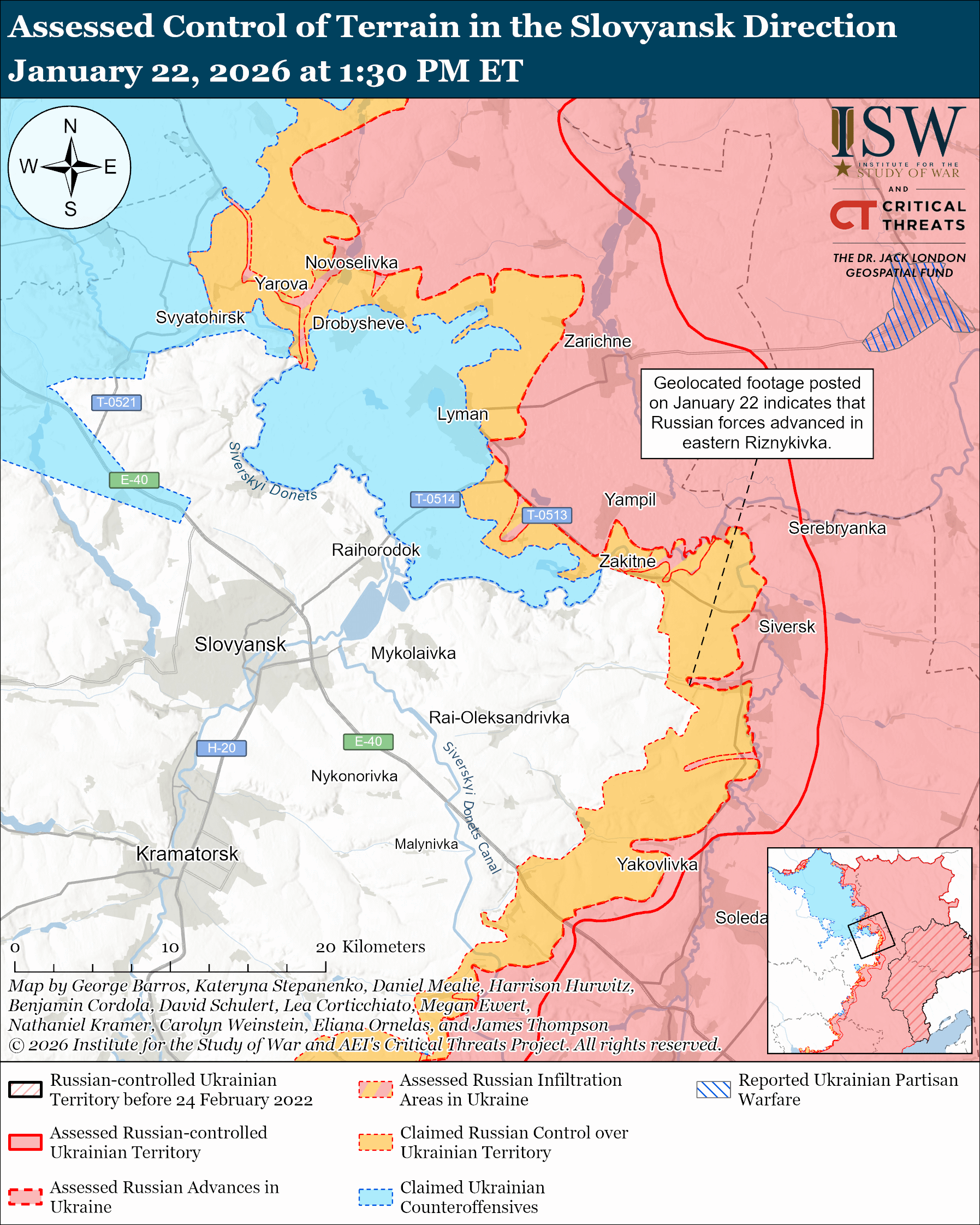 Assessed Russian advances: Geolocated footage published on January 22 indicates that Russian forces recently advanced in Riznykivka (east of Slovyansk).[xlvi]