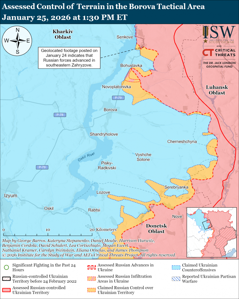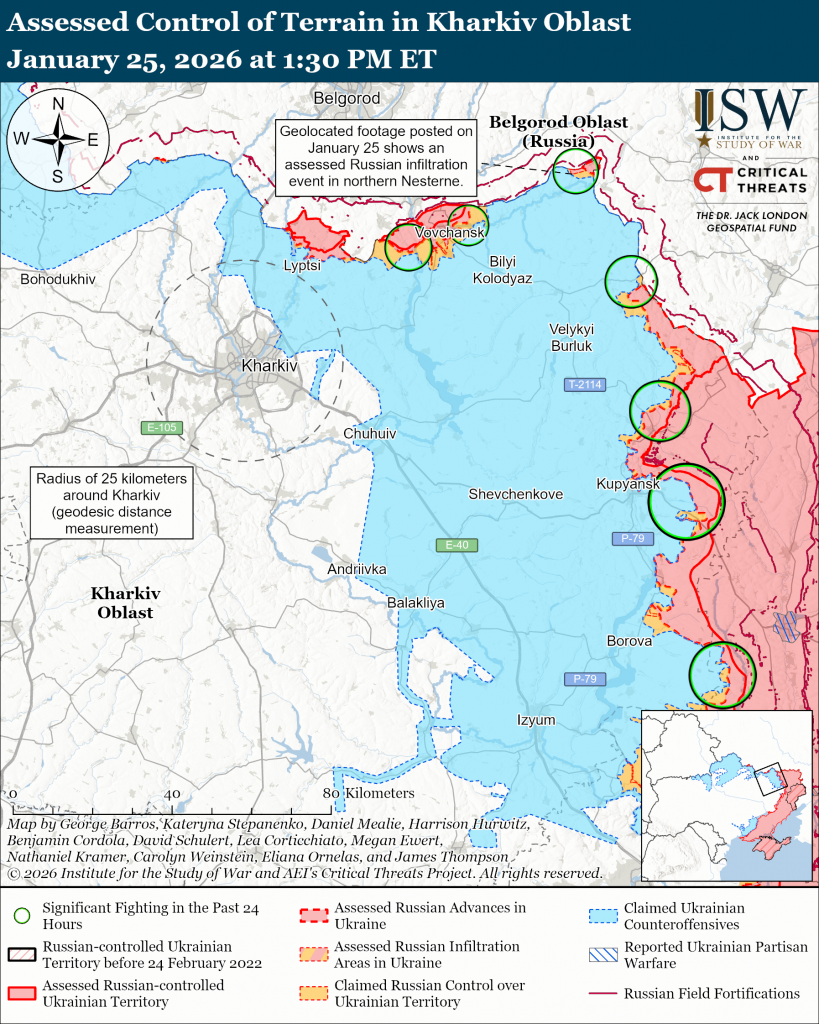 Assessed Russian infiltrations: Geolocated footage published on January 25 shows Ukrainian forces striking a Russian position in northern Nesterne (northeast of Kharkiv City) after what ISW assesses was a Russian infiltration mission that did not change the control of terrain of the forward edge of the battle area (FEBA) at this time.[xviii]