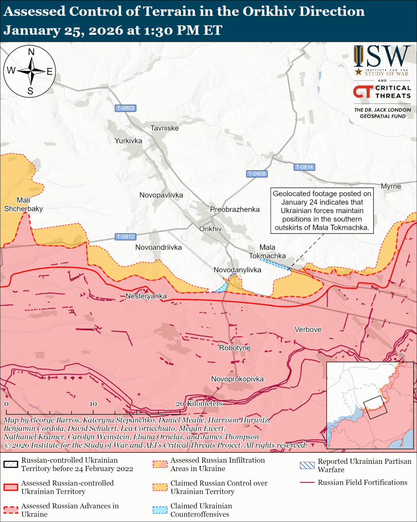 Refinement of areas under Russian control: The geolocated footage published on January 24 indicates that Ukrainian forces also maintained positions or recently advanced in the southern outskirts of Mala Tokmachka, areas where Russian sources previously claimed that Russian forces maintained positions.[xlix]