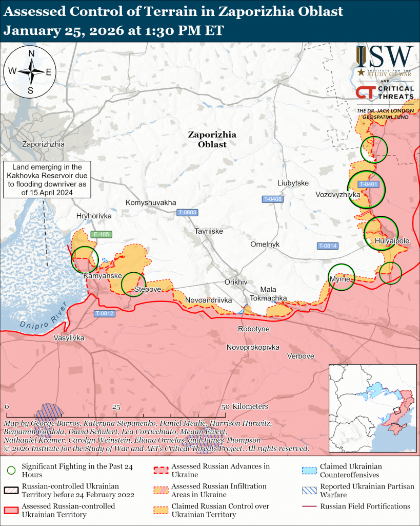 Russian forces attacked east of Orikhiv near Myrne; west of Orikhiv near Plavni, Prymorske, and Stepove; and northwest of Orikhiv near Lukyanivske, Pavlivka, Novoyakovlivka, and Novoboikivske on January 24 and 25.[l]
