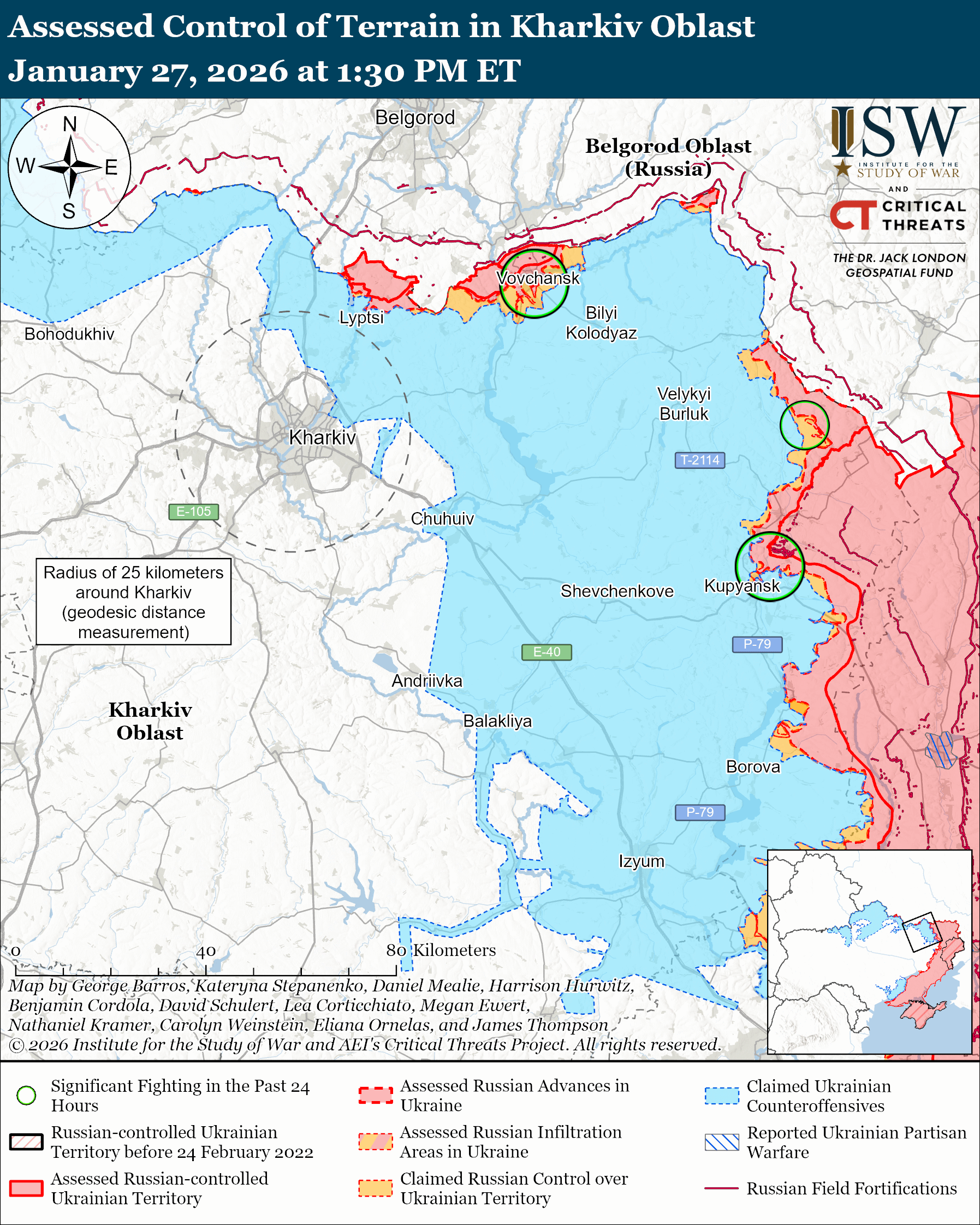 Russian forces attacked northeast of Kharkiv City near Vovchansk, Vovchanski Khutory, Prylipka, Lyman, Nesterne, and Dehtyarne and toward Hrafske on January 26 and 27.[58]