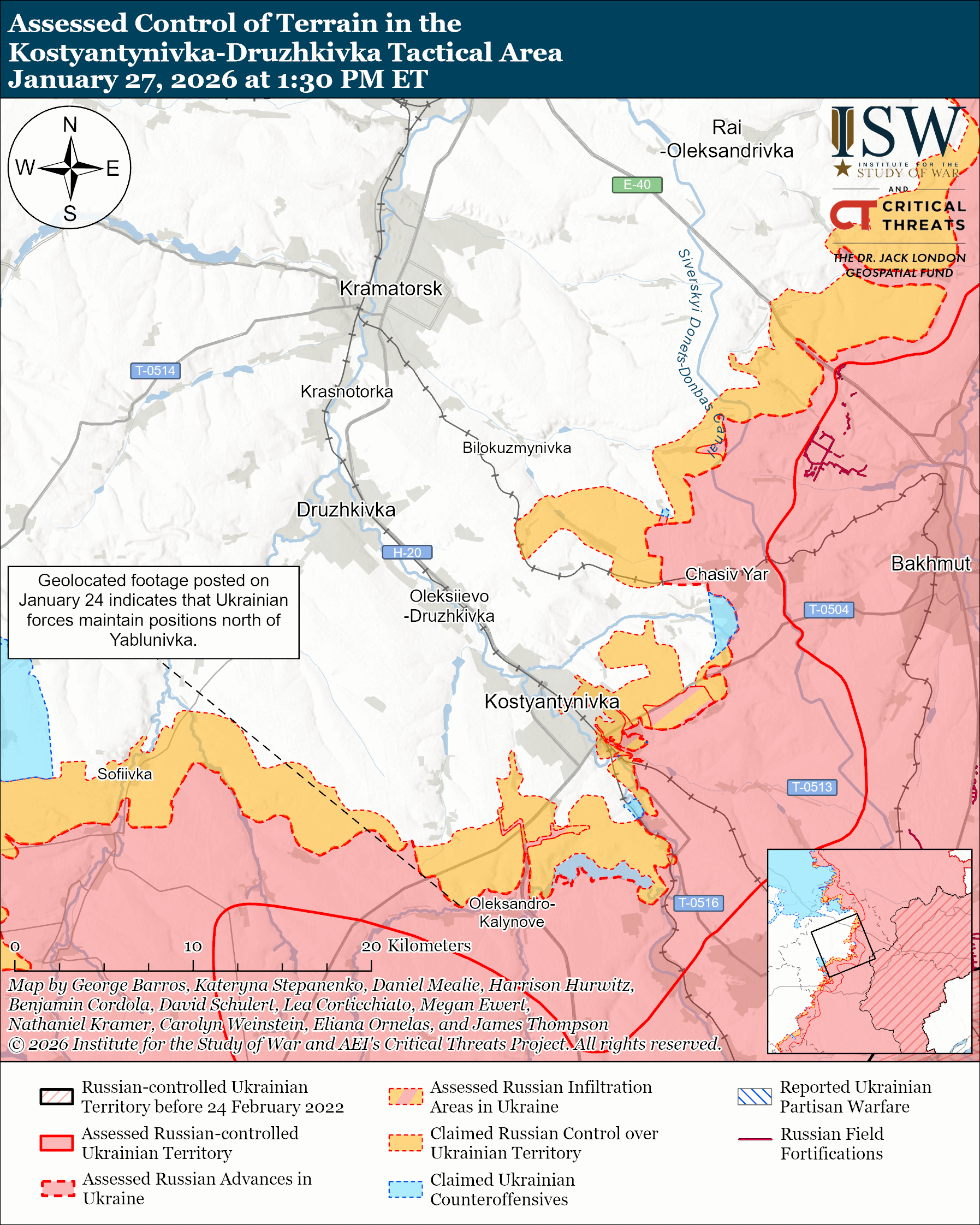 Refinement of area under Russian claims: Geolocated footage published on January 22 and 23 shows Russian forces striking Ukrainian positions in northeastern Minkivka (northeast of Kostyantynivka) and in northern Yablunivka (southwest of Kostyantynivka) – areas where Russian sources previously claimed that Russian forces maintained a presence.[75] ISW assesses that these changes did not occur in the past 24 hours.