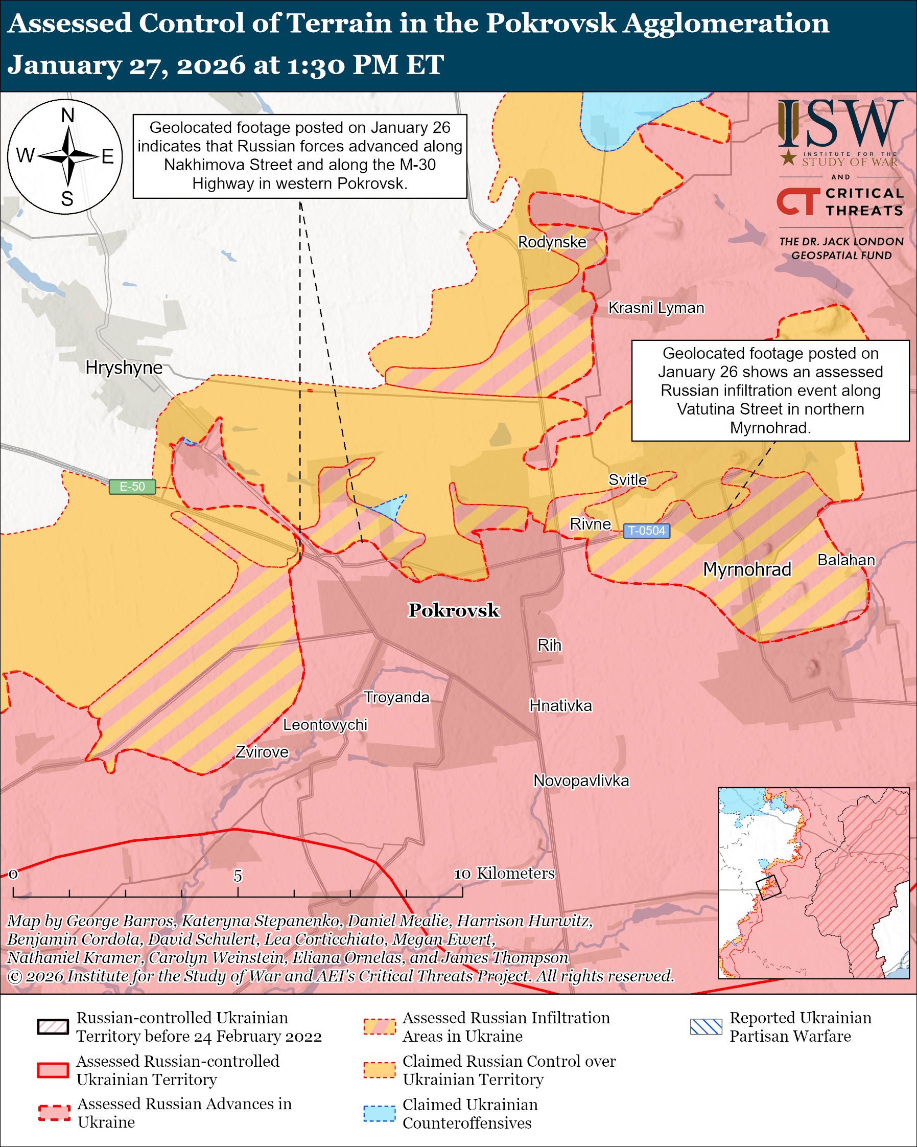 Ukrainian 7th Rapid Reaction Corps of the Air Assault Forces Spokesperson Volodymyr Polevyi reported on January 27 that Ukrainian forces partially control northern Pokrovsk and Myrnohrad (east of Pokrovsk) as Russian forces continue attempts to envelop Ukrainian positions from the north and from Kotlyne.[95] Polevyi added that Russian forces have withdrawn elements of the exhausted 76th Airborne (VDV) Division from the frontline. ISW continues to assess that Russian forces will eventually seize Pokrovsk and Myrnohrad following a 22-month campaign, though Ukrainian forces maintain some tactical positions in the Pokrovsk pocket for the time being.[96] The corps reported on January 27 that Russian forces are accumulating troops and vehicles in occupied Novohrodivka (southeast of Pokrovsk and southeast of Myrnohrad) for attacks on northern Myrnohrad.[97] The corps added that the Russian military command in the Pokrovsk direction continues to direct its main efforts against Hryshyne, concentrating light vehicles and personnel on the northern outskirts of Pokrovsk. The corps reported that Russian forces recently infiltrated Hryshyne but that Ukrainian forces repelled them. The corps noted that Russian forces are using fiber-optic drones with a range of over 20 kilometers. The spokesperson of a Ukrainian drone battalion operating in the Pokrovsk direction reported on January 27 that Russian forces are intensifying their usage of Molniya fixed-wing first-person view (FPV) drones for supply drops and in mothership, false target, reconnaissance, strike, and repeater roles near Myrnohrad.[98]