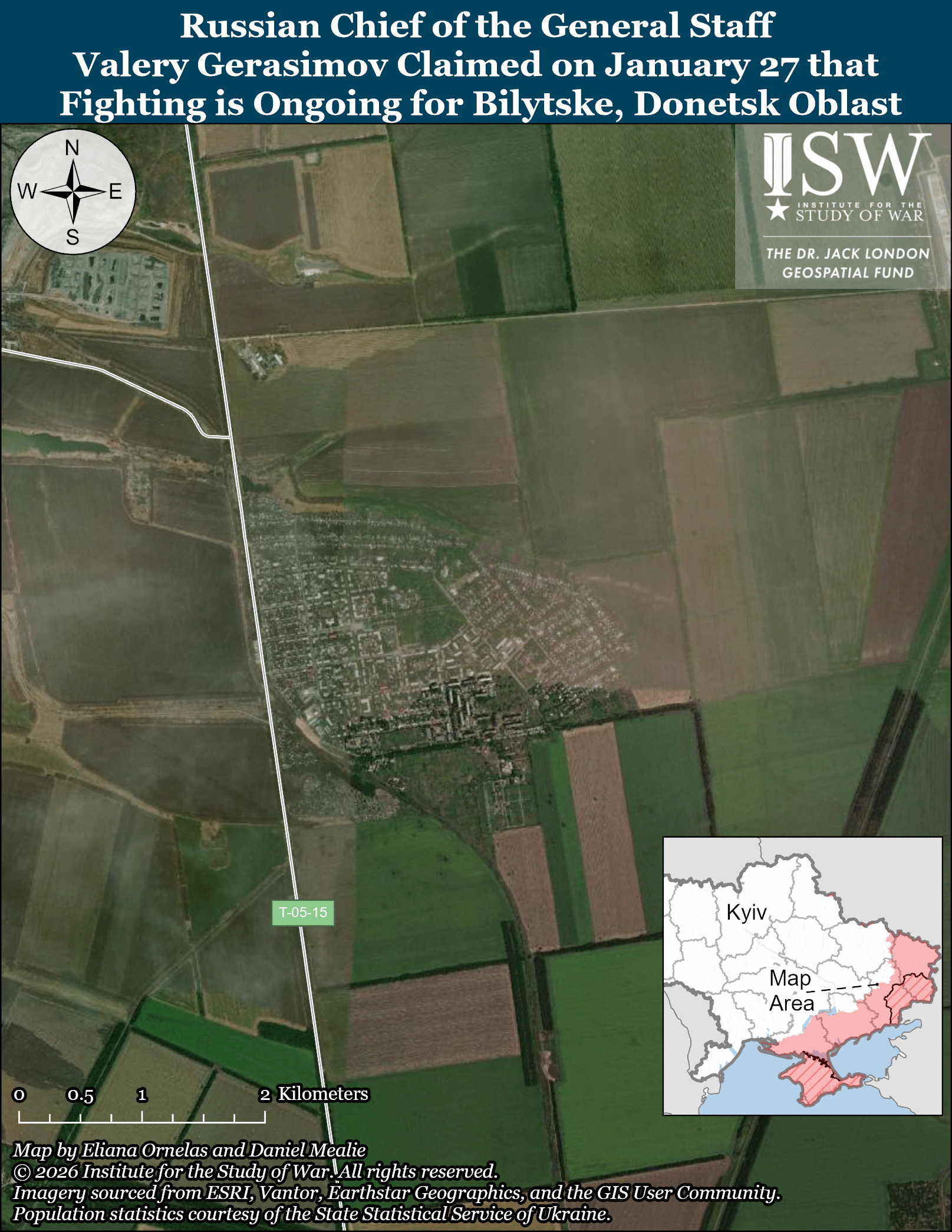 Russian forces attacked near and within Pokrovsk itself; northwest of Pokrovsk near Hryshyne and toward Shevchenko; north of Pokrovsk near Rodynske and Bilytske; east of Pokrovsk near Myrnohrad; and southwest of Pokrovsk near Kotlyne, Udachne, Novopidhorodne, and Molodetske on January 26 and 27.[93] A Russian milblogger claimed that Ukrainian forces counterattacked near Rodynske.[94]