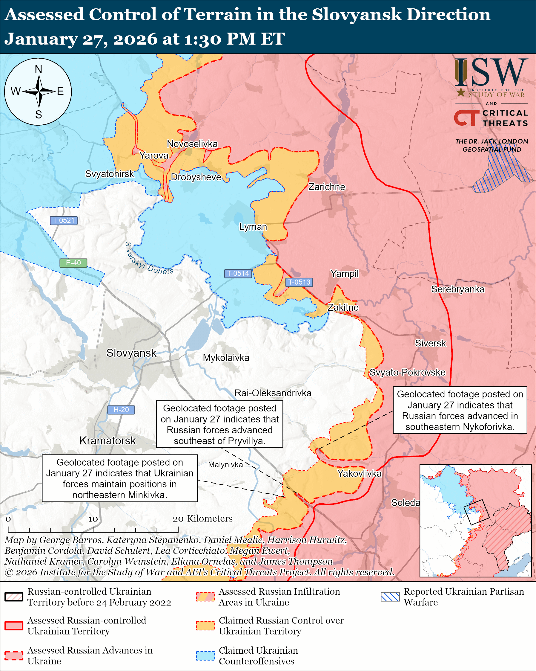 Assessed Russian advances: Geolocated footage published on January 27 indicates that Russian forces recently seized Khromivka and advanced in southeastern Nykyforivka (both southeast of Slovyansk).[69]