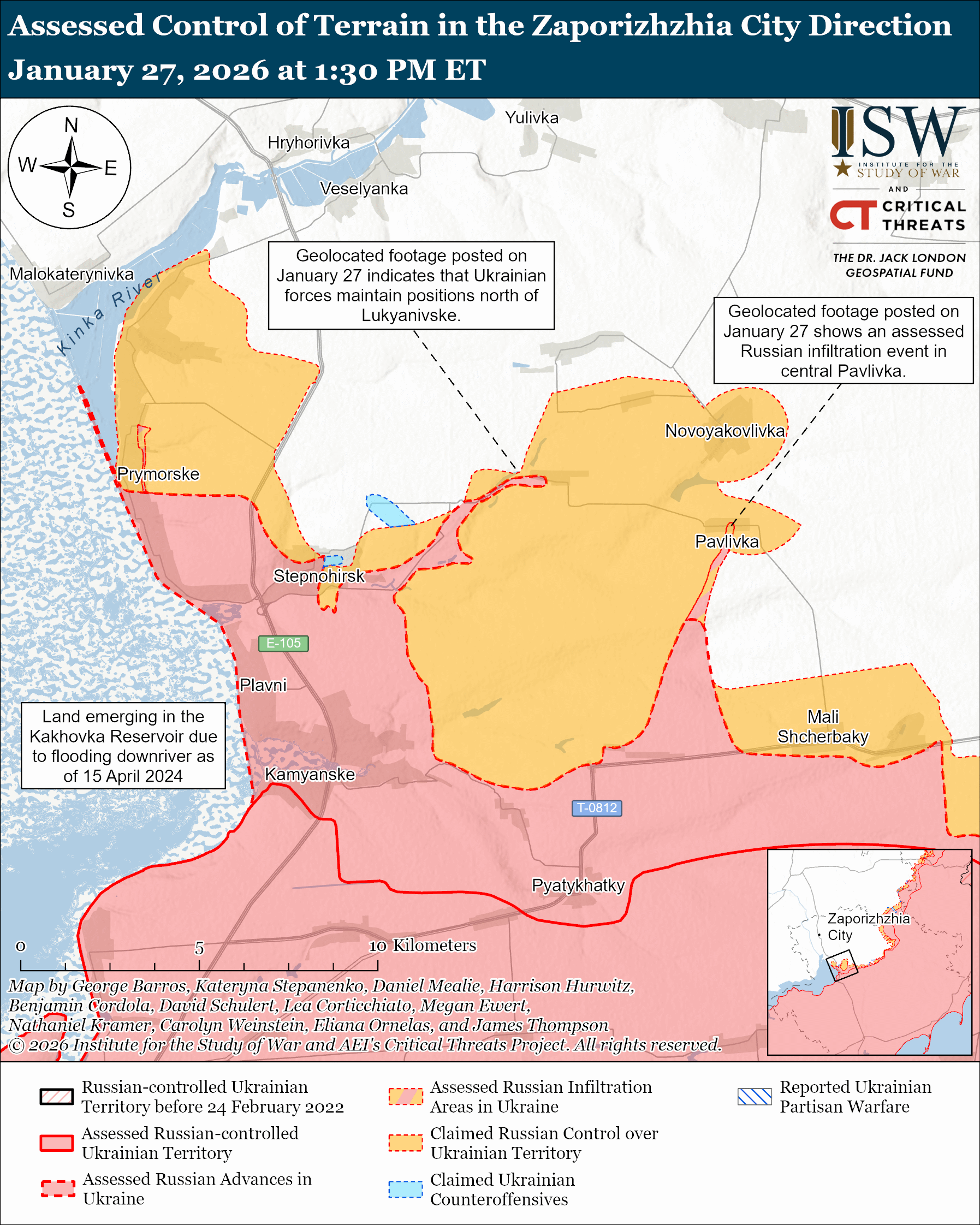 Assessed Russian infiltrations: Geolocated footage published on January 27 shows Ukrainian forces striking Russian forces in central Pavlivka (northwest of Orikhiv) after what ISW assesses was a Russian infiltration mission that did not change the control of terrain or the forward edge of the battle area (FEBA) at this time.[111]