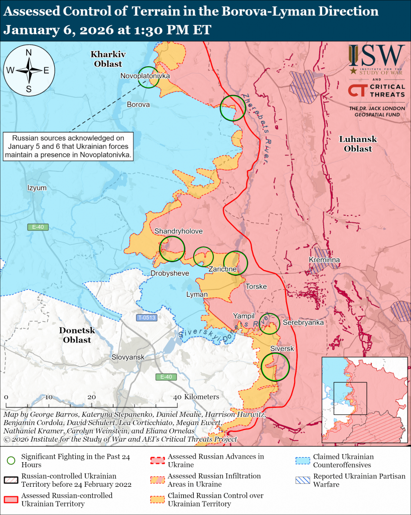 Russian forces attacked northeast of Borova near Novoplatonivka and east of Borova near Nadiya on January 5 and 6.[32]