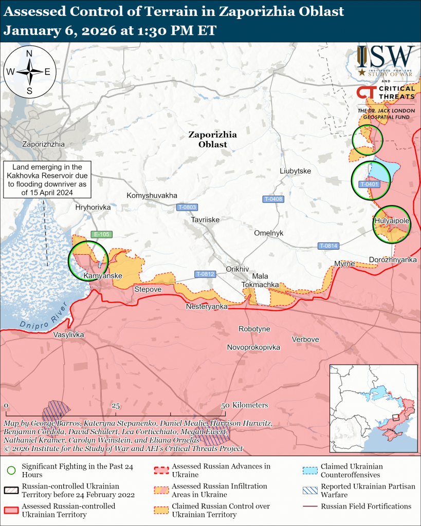 Russian forces attacked west of Orikhiv near Plavni and Prymorske and northwest of Orikhiv toward Veselyanka and Hryhorivka on January 5 and 6.[71]