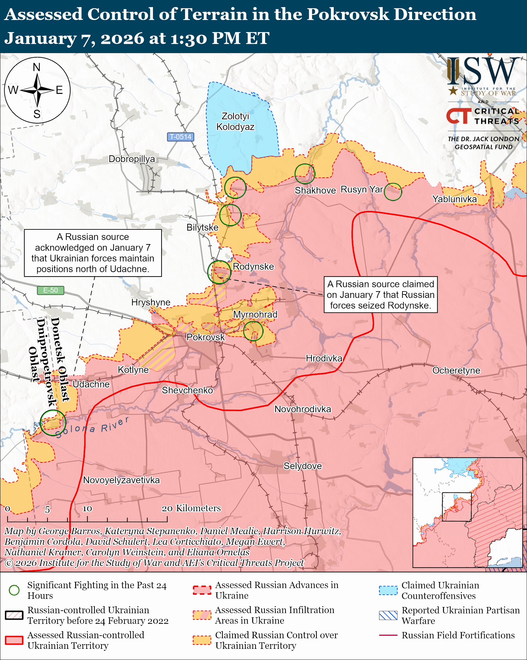 Refinement of areas under Russian claims: A Russian milblogger indicated on January 7 that Ukrainian forces advanced northwest of Udachne (southwest of Pokrovsk), an area in which Russian sources previously claimed that Russian forces maintained positions.[63]