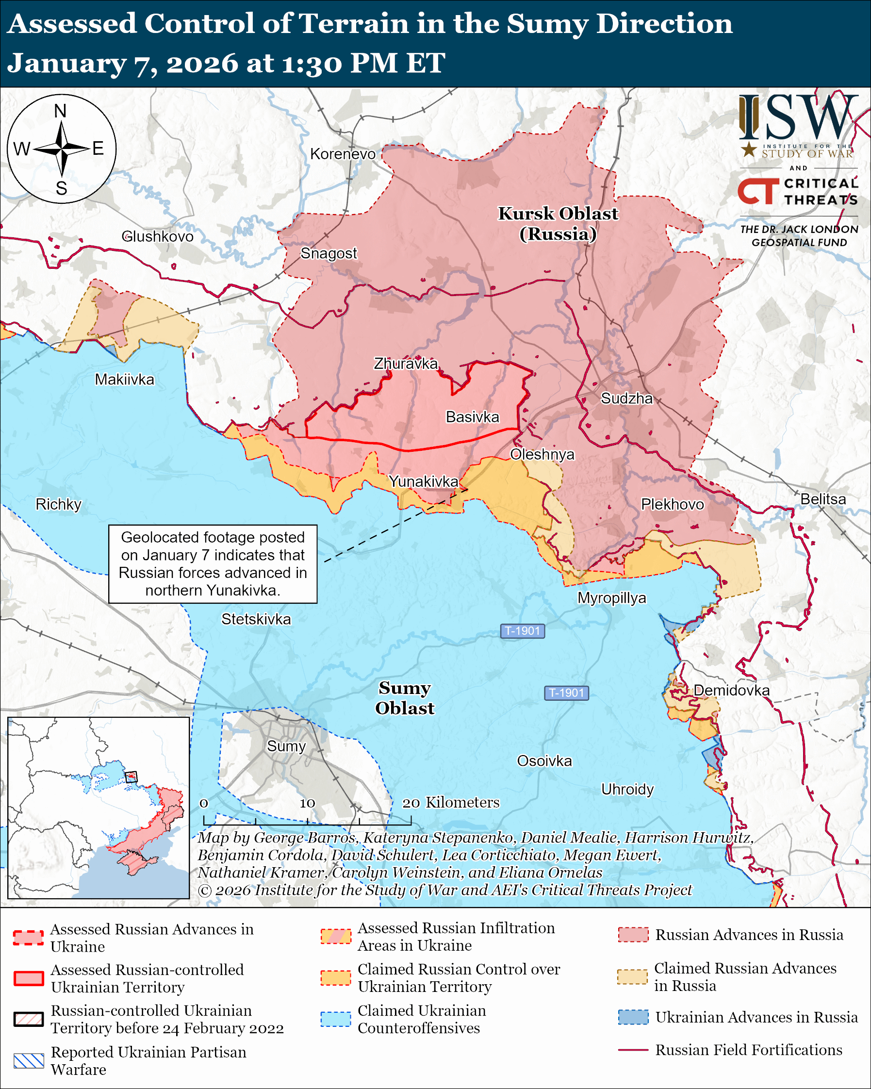 Russian forces attacked north of Sumy City near Varachyne, Bilovody, and Oleksiivka and toward Andriivka, Nova Sich, and Khrapivshchyna; northeast of Sumy City near Yablunivka; and southeast of Sumy City near Hrabovske and toward Krasnopillya on January 6 and 7.[31]