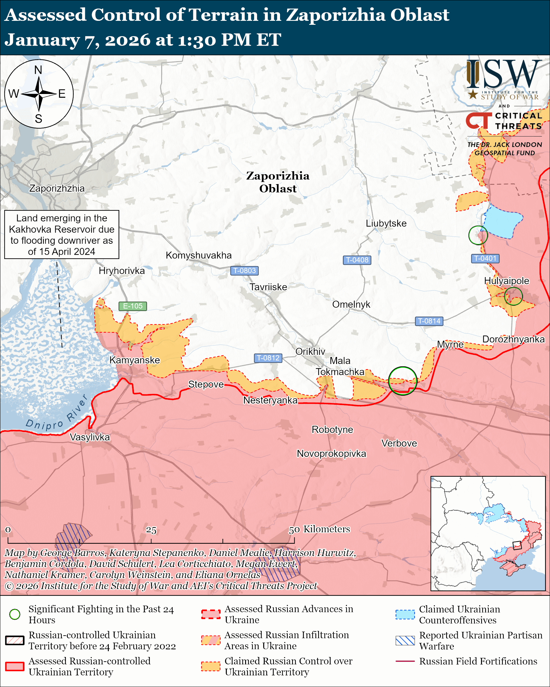 A source reportedly affiliated with Ukrainian military intelligence reported on January 6 that Ukrainian forces cleared Russian small groups that infiltrated into the Ukrainian near rear in Svyatopetrivka (northwest of Hulyaipole), Olenokostyantynivka (north of Hulyaipole), Staroukrainka (west of Hulyaipole), Pryluky, Varvarivka, and Zelene and near Zaliznychne (west of Hulyaipole) on January 5.[78] The source noted that Russian forces exploited unfavorable weather conditions that degraded Ukrainian drone operations to infiltrate the Ukrainian near rear and engaged Ukrainian drone operators and artillery crews with small arms.