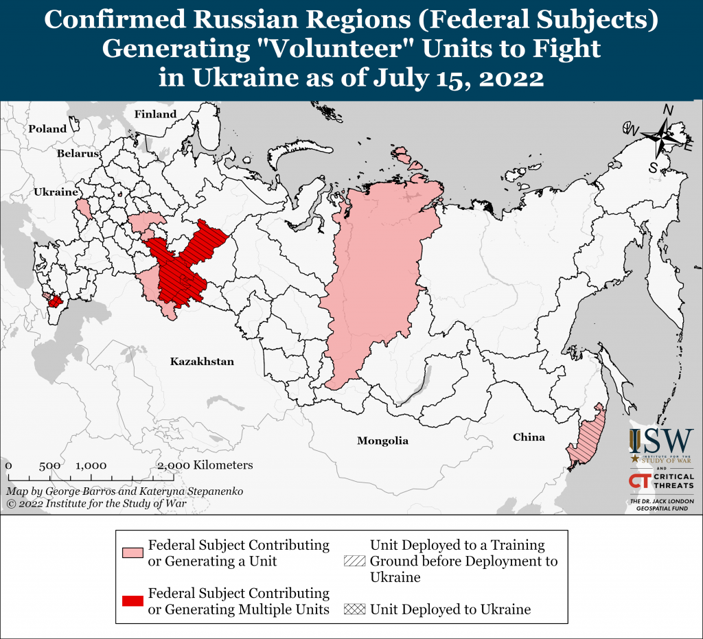 Russian President Vladimir Putin’s likely effort to shield ethnic Russians from high levels of mobilization may trigger resistance in some of the ethnic enclaves that seem to be disproportionately bearing the burden of war. Russian Telegram channel Rybar released a report on July 18 about the Novaya Tuva movement- an anti-war organization comprised of activists from the Tuvan ethnic minority enclave.[5] Rybar accused the Novaya Tuva movement of disseminating anti-war propaganda and inciting ethnic discord within the Russian Federation. This report is noteworthy in the context of the recent increase in the formation of regionally-based volunteer battalions through Russia, many of which fall along distinct ethnic lines.[6] ISW and others have previously noted the prevalence of non-ethnic Russian battalions fighting in Ukraine, which include troops from Chechnya, South Ossetia, Tuva, Tartarstan, Bashkortostan, Chuvashia, and others.[7] These indicators suggest that Putin may be unwilling to conduct general mobilization in part due to a reluctance to mobilize large numbers of ethnic Russians. Rybar’s post as well as previous reporting on a ”Free Buryatia” anti-war group bring to the fore the risk that Putin’s apparent desire to have non-Russians bear the brunt of the war at this stage could create domestic tension in these regions.