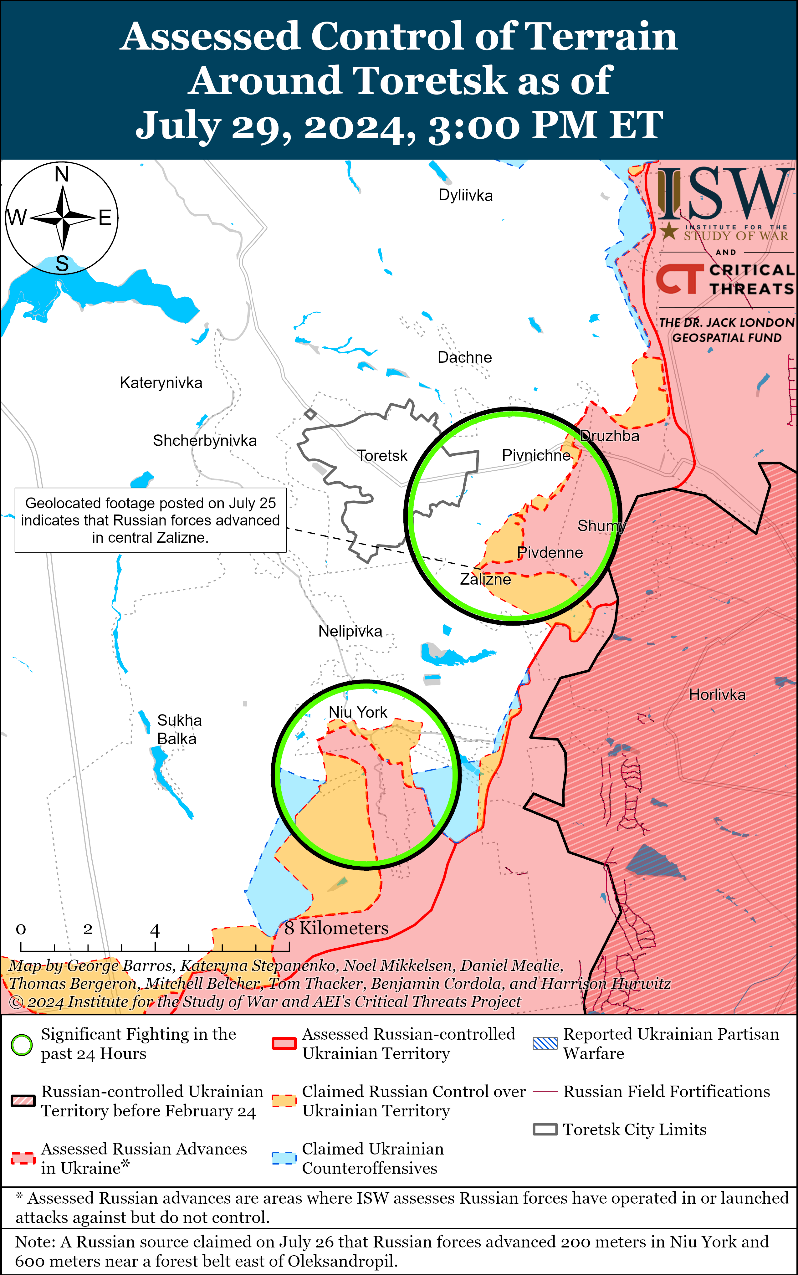 Russian forces maintained a high rate of attacks in the Toretsk direction on July 29 and reportedly advanced in some areas. Russian milbloggers claimed that Russian forces continue attacking and advancing within southwestern Niu York (south of Toretsk), southwest of Yurivka (just south of Niu York), and in Zalizne and Pivnichne (both just southeast of Toretsk).[xxxvi] The Ukrainian General Staff reported that Russian forces attacked near Toretsk, Niu York, Pivnichne, and Zalizne and noted that Russian forces are striking Toretsk with guided glide bombs.[xxxvii]