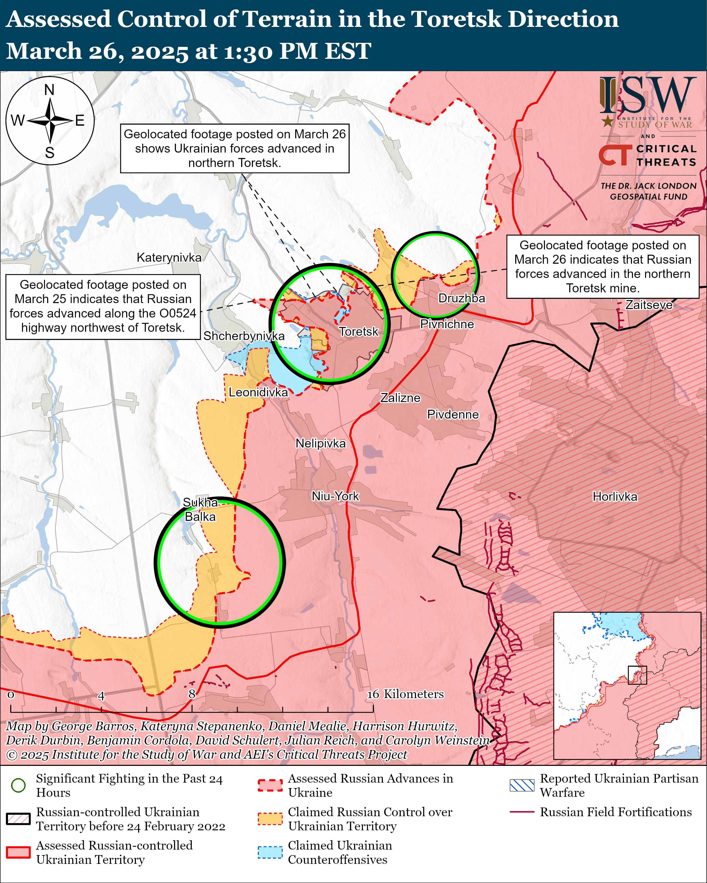 Assessed Russian advances: Geolocated footage published on March 25 indicates that Russian forces recently advanced in the Toretska mine in northern Toretsk and westward along the O0524 highway northwest of Toretsk.[42]