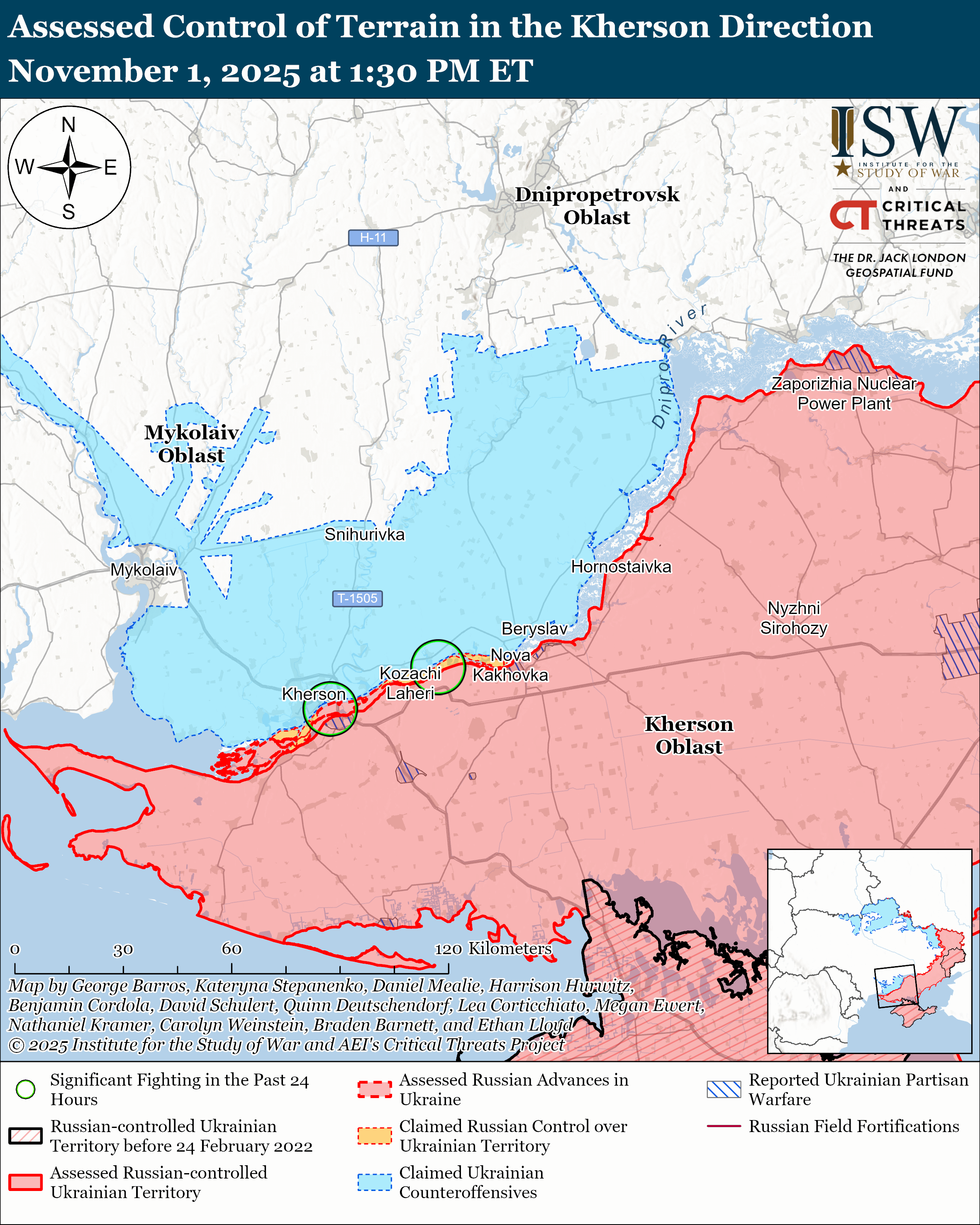 Russian forces continued limited ground operations in the Kherson direction, including east of Kherson City toward the Antonivskyi Roadway Bridge, on October 31 and November 1, but did not advance.[lxxvi]