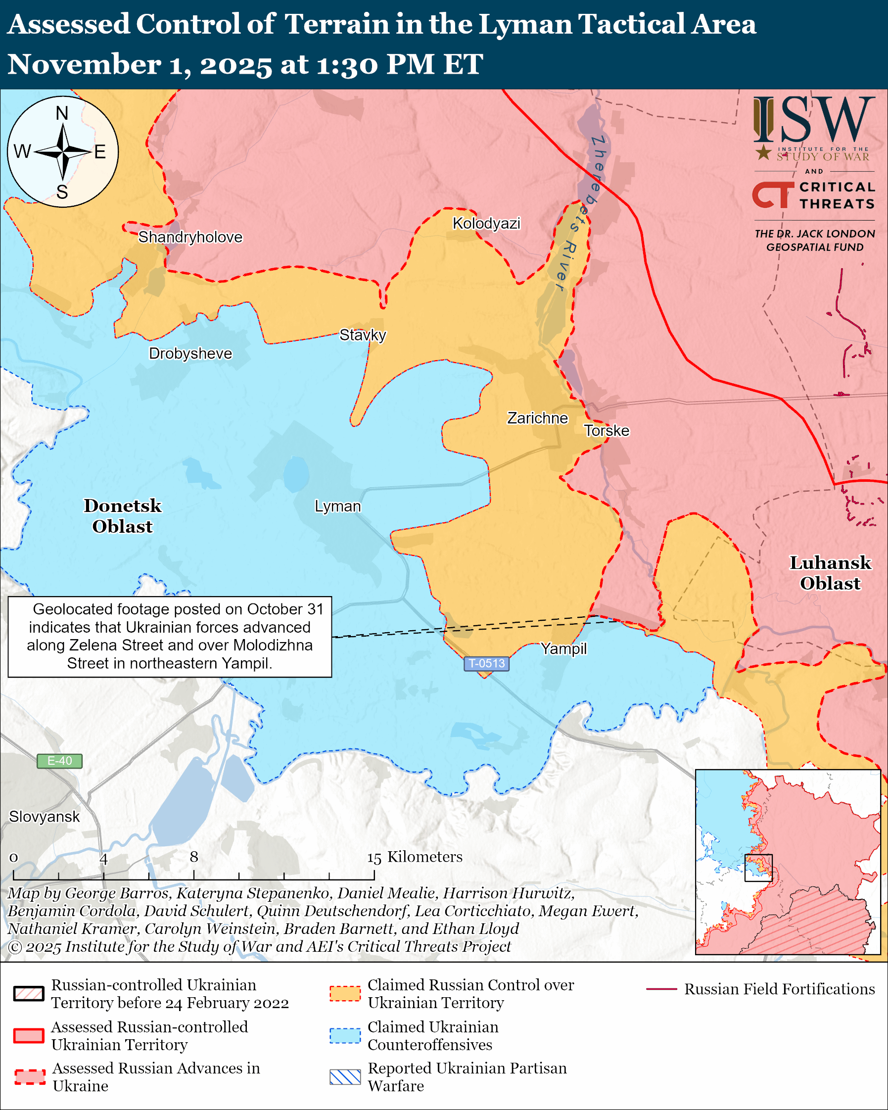 Assessed Ukrainian advances: Geolocated footage published on October 31 indicates that Ukrainian forces recently advanced in northeastern Yampil (southeast of Lyman).[xlvi]