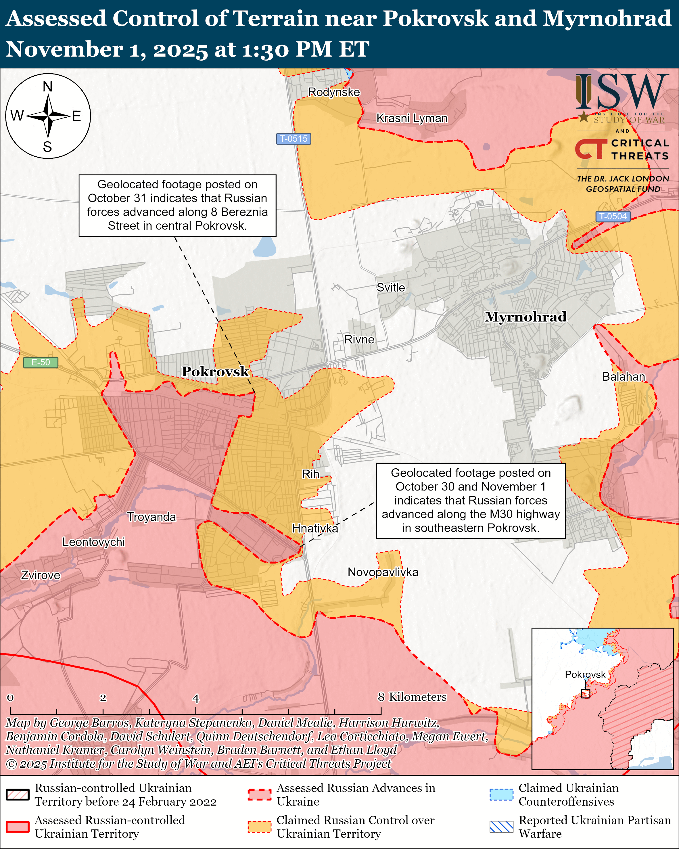 Russian forces are intensifying offensive operations in and around Pokrovsk to seize the town. Geolocated footage published on October 31 and November 1 indicates that Russian forces recently advanced in central and southeastern Pokrovsk.[i] Russian milbloggers claimed that Russian forces also advanced in central Pokrovsk beyond what the geolocated footage supports, in northeastern Pokrovsk, and northeast of Kotlyne (southwest of Pokrovsk).[ii] A senior officer of a Ukrainian brigade operating in the Pokrovsk direction told Ukrainian outlet Hromadske on October 31 that Russian forces are operating in roughly 60 percent of Pokrovsk and have entered Rodynske (north of Pokrovsk) and Myrnohrad (east of Pokrovsk).[iii] Geolocated footage published on October 31 and November 1 indicates that Ukrainian forces maintained positions or recently advanced in central Rodynske (north of Pokrovsk), an area where Russian sources previously claimed that Russian forces maintained a presence.[iv] The chief sergeant of a Ukrainian brigade operating to the east in the Kostyantynivka-Druzhkivka tactical area (northeast of Pokrovsk) reported on November 1 that Russian forces significantly decreased offensive operations in the Kostyantynivka direction after a failed mechanized assault on October 27 and suggested that Russian forces may have redeployed forces from this direction to reinforce Russian efforts against Pokrovsk and Myrnohrad.[v] A Ukrainian drone operator operating in Pokrovsk indicated to Hromadske that Russian forces are tactically isolating some Ukrainian positions.[vi] The spokesperson of a Ukrainian brigade operating in the Pokrovsk direction told Hromadske that Ukrainian logistics in the direction are “complicated” but that Russian forces have not cut Ukrainian ground lines of communication (GLOCs). A Ukrainian servicemember operating in Myrnohrad told Hromadske that the Russian forces operating in northern Pokrovsk and northeastern Myrnohrad "feel completely at ease" and that Russian first-person view (FPV) drone operators are within range to interdict Ukrainian GLOCs connecting Pokrovsk and Myrnohrad. An officer of a Ukrainian unit operating in Myrnohrad told Hromadske that Russian forces have almost complete fire control over the narrow Ukrainian GLOC supplying Myrnohrad. The porous nature of the frontline and ubiquity of drones in this area continue to obscure the tactical picture in Pokrovsk, and ISW will provide an updated assessment as the situation becomes clearer.