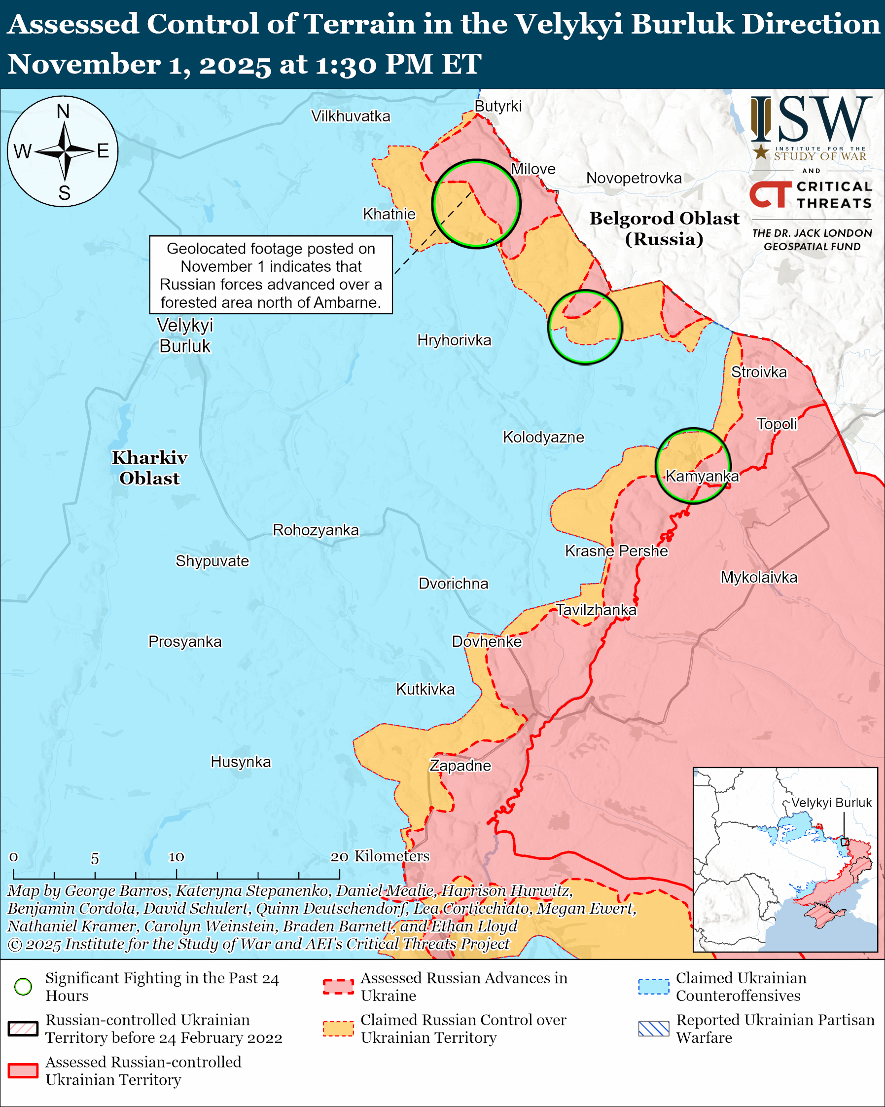Assessed Russian advances: Geolocated footage published on November 1 indicates that Russian forces recently advanced north of Ambarne (northeast of Velykyi Burluk).[xxxvii]