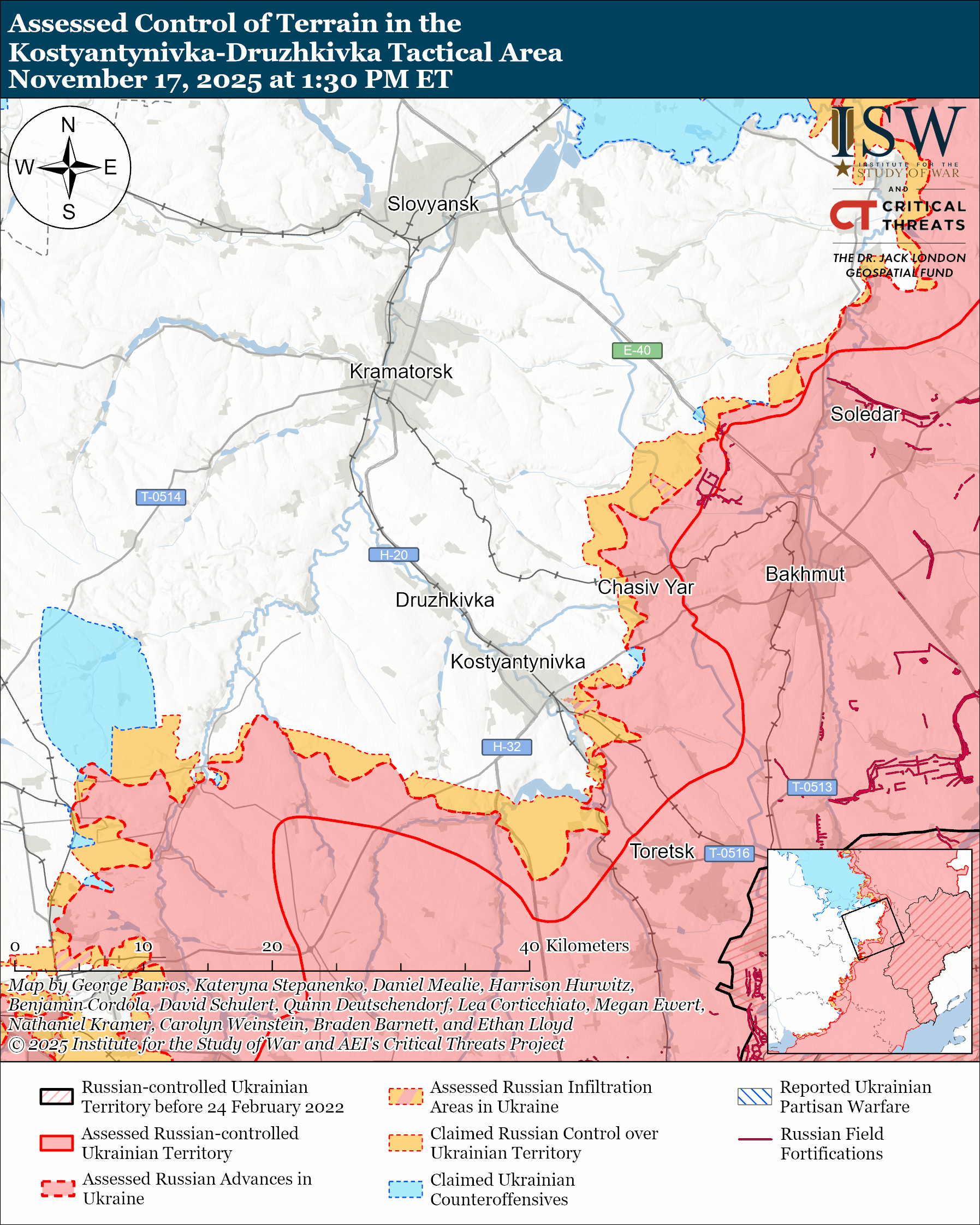 Russian forces continue offensive operations in the Kostyantynivka-Druzhkivka tactical area on November 17 but did not advance.