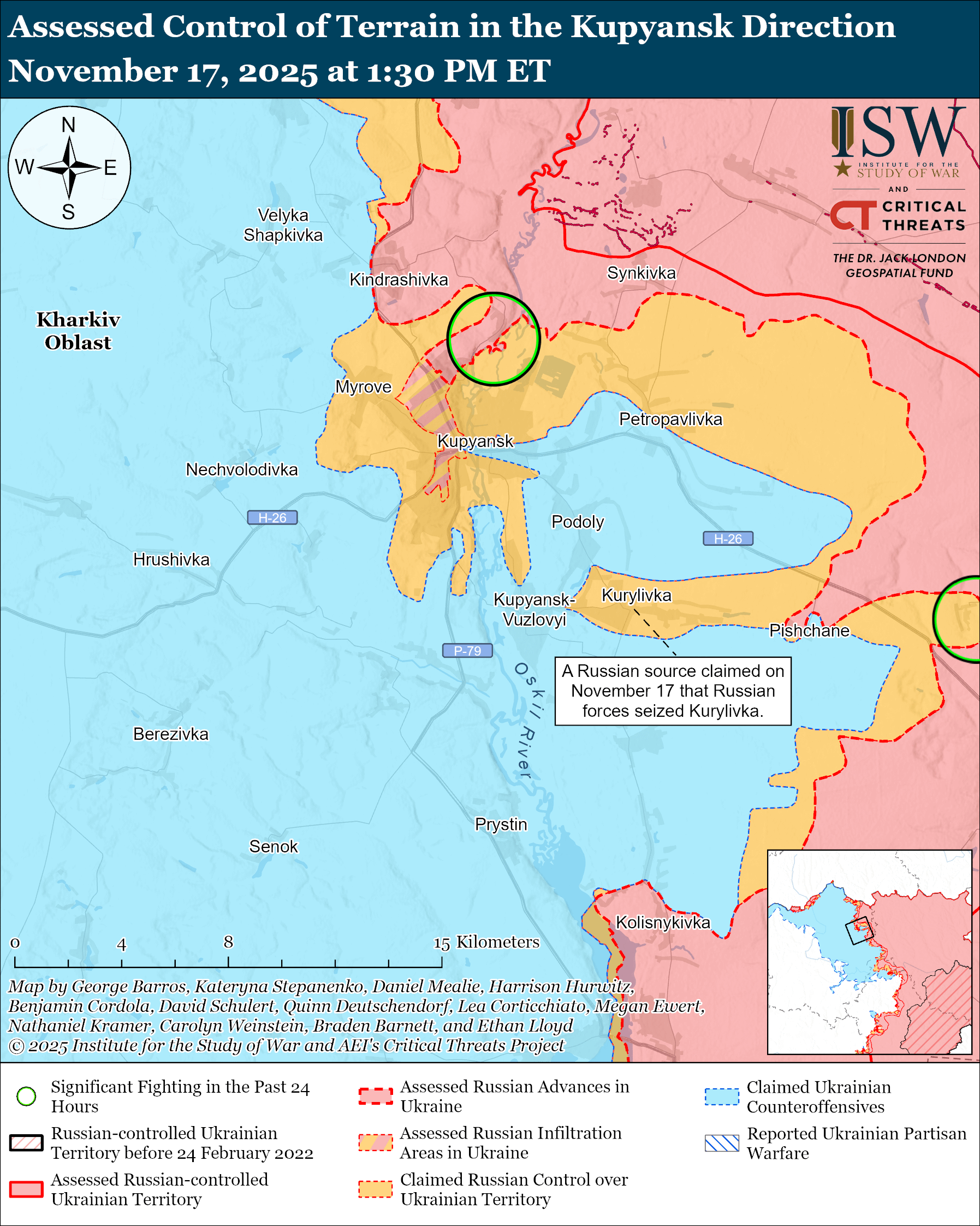 Russian forces continued offensive operations in the Velykyi Burluk direction on November 17 but did not make confirmed advances.