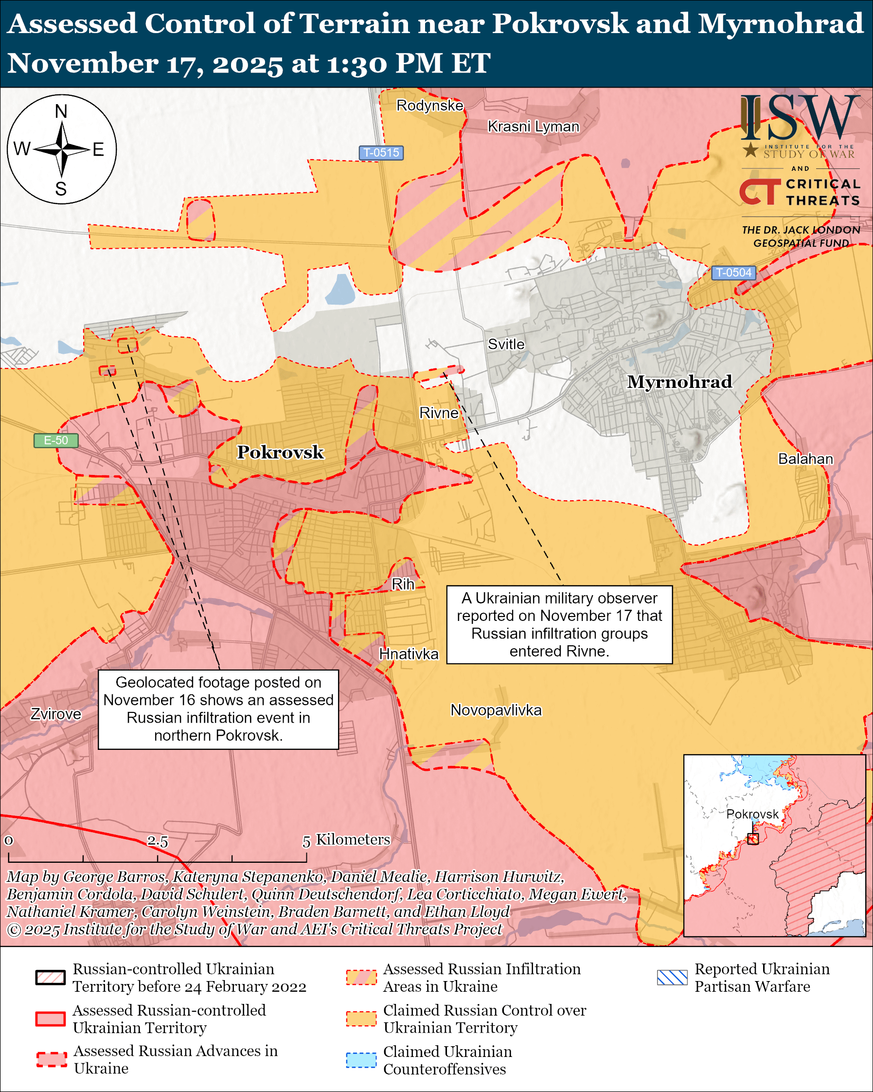 Assessed Russian infiltrations: Geolocated footage posted on November 16 shows Ukrainian forces striking Russian-occupied buildings in northern Pokrovsk.[lxx] ISW cannot independently verify the likely route of infiltration of Russian forces in northern Pokrovsk. Ukrainian military observer Kostyantyn Mashovets reported on November 17 that Russian infiltration groups reached the T-0515 highway southwest of Krasnyi Lyman (northeast of Pokrovsk) and entered Rivne (east of Pokrovsk).[lxxi] ISW assesses that none of these infiltration events changed the control of terrain or the forward edge of battle (FEBA) at this time.