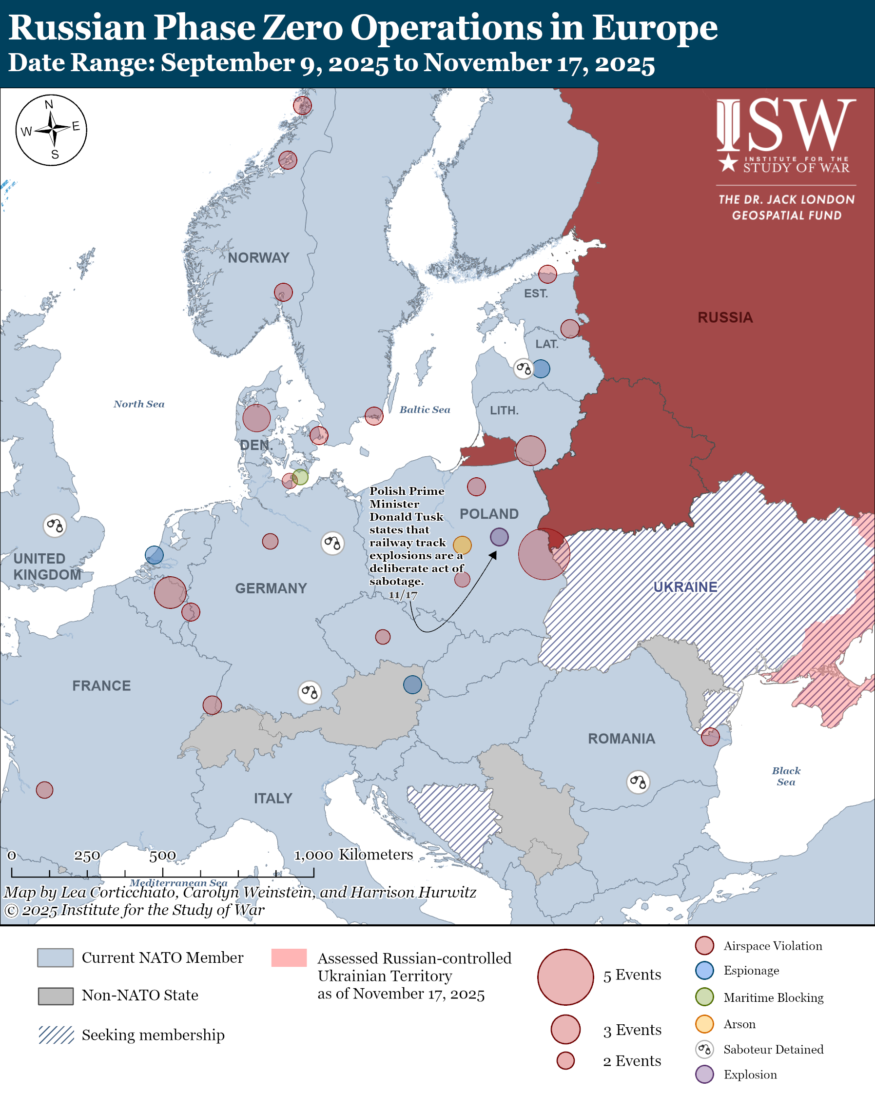 Saboteurs recently damaged at least two segments of a Polish railway on a route to Ukraine. Polish police reported that a train conductor observed damage to a portion of the Lublin-Warsaw railway line near Życzyn, Poland on the morning of November 16.[xvii] Polish Prime Minister Donald Tusk stated on November 17 that an explosion from an act of sabotage destroyed portions of the Lublin-Warsaw railway line near Mika and Lublin.[xviii] Polish authorities have not attributed the explosions to a specific actor as of this writing. Investigative journalist Christo Grozev published images of a damaged rail track near Warsaw and an electrical cable laid across the track on the route to Rzeszów.[xix] Grozev assessed that the cable was 300 meters long and led to a nearby parking lot, allowing a saboteur to remotely detonate an explosive device. It is unclear whether this incident on the Warsaw–Rzeszów railway line is connected to the incidents on the Warsaw-Lublin line. The Lublin-Warsaw and Warsaw–Rzeszów railway lines support Western military assistance deliveries to Ukraine.[xx] The rail line explosions come against the backdrop of Russia’s intensifying “Phase Zero” campaign to destabilize Europe, undermine NATO’s cohesion, and set the political, informational, and psychological conditions for a potential future Russian war against NATO.[xxi]