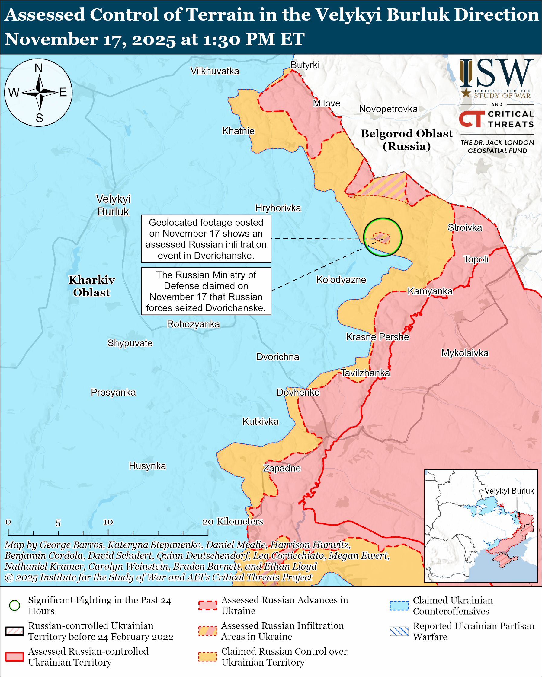 Assessed Russian infiltrations: Geolocated footage published on November 17 shows elements of the Russian 9th Motorized Rifle Regiment (18th Motorized Rifle Division, 11th Army Corps [AC], LMD) raising a flag in central Dvorichanske (southeast of Velykyi Burluk) during what ISW assesses was a Russian infiltration mission that did not change the control of terrain or forward edge of battle area (FEBA) at this time.[xxxiii] ISW cannot independently verify the likely route of infiltration of Russian forces to Dvorichanske.