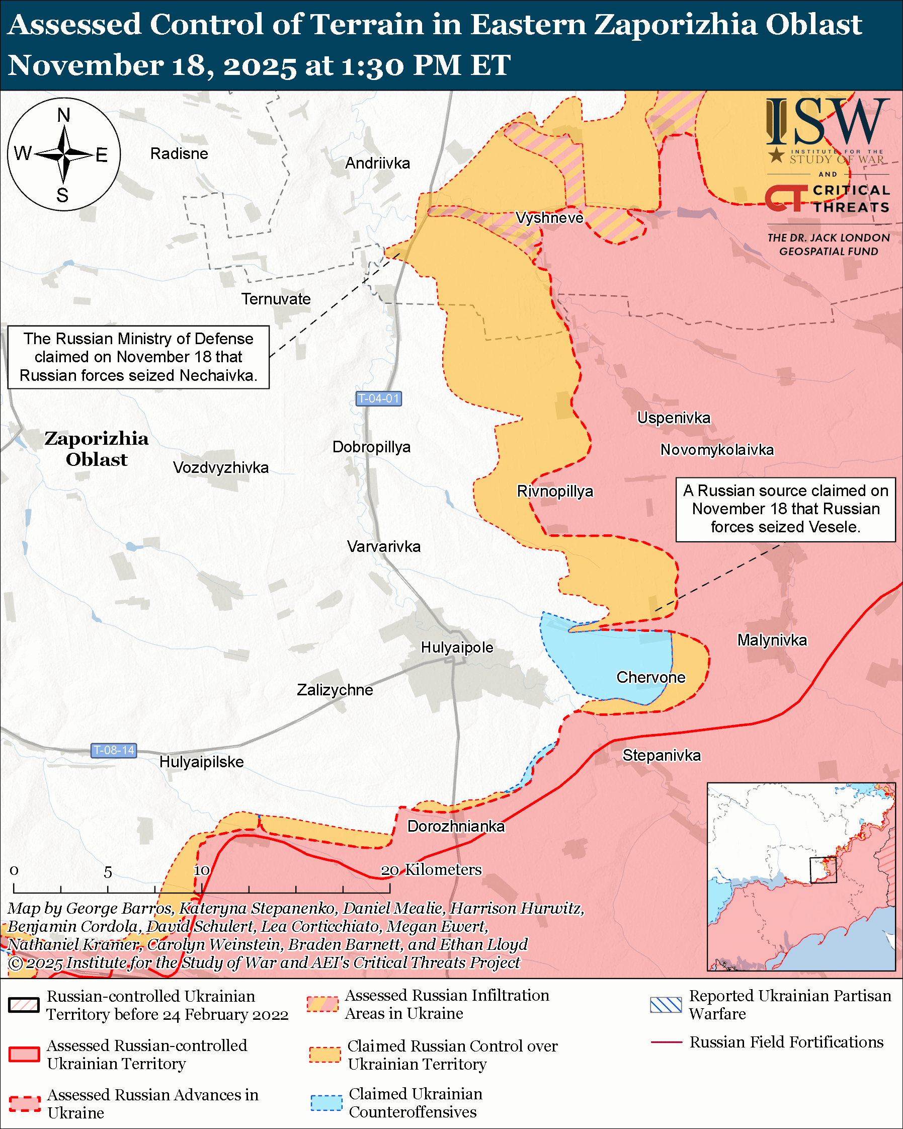 Unconfirmed claims: The Russian Ministry of Defense (MoD) claimed on November 18 that Russian forces seized Nechaivka (north of Hulyaipole along the T-0401 Hulyaipole-Pokrovske highway).[96] A Kremlin-affiliated Russian milblogger claimed that fighting is ongoing on the settlement's northern outskirts and noted that there is no footage confirming the alleged seizure.[97] Russian milbloggers claimed that Russian forces seized Vesele (east of Hulyaipole) and advanced west of Rivnopillya, southwest of Yablukove (both north of Hulyaipole), and west of Vesele.[98]