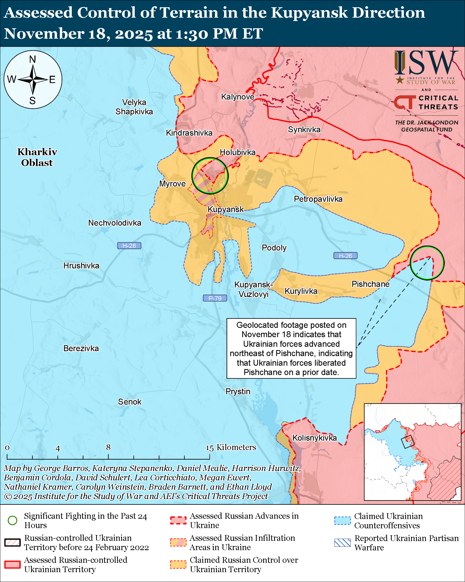 Assessed Ukrainian advances: Geolocated footage published on November 18 indicates that Ukrainian forces liberated Pishchane (southeast of Kupyansk) and advanced northeast of the settlement, though likely did not make these advances recently.[57]