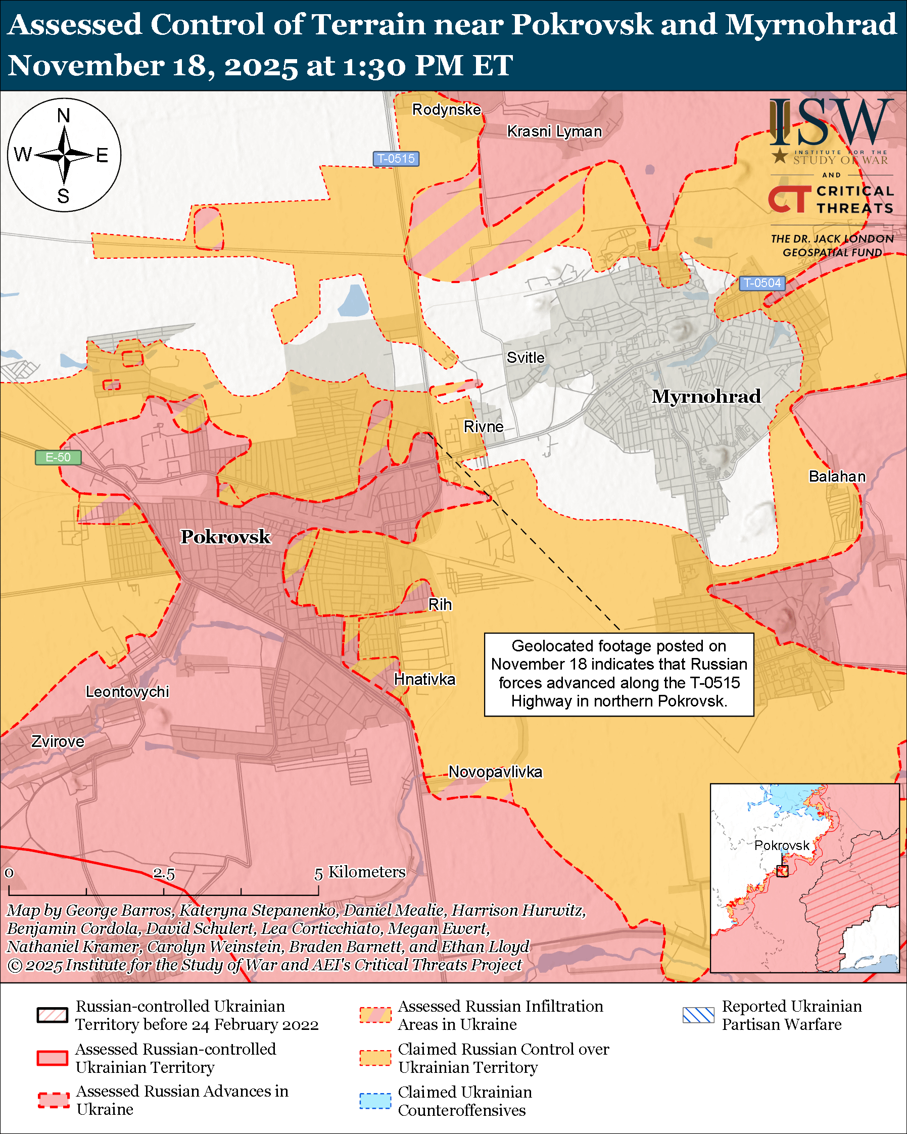 Russian forces are struggling to focus on a single decisive objective in the Pokrovsk direction and instead continue simultaneous attempts to close the encirclement of the wider Pokrovsk-Myrnohrad pocket while also attacking within both towns. The Russian military command does not appear to be focusing forces and means on completing the encirclement of the Pokrovsk-Myrnohrad area, which would normally be the fastest and least costly way to seize the entire area, and instead continues to pursue some level of head-on attacks. Geolocated footage published on November 18 and reportedly filmed on November 16 indicates that Russian forces recently advanced within northeastern Pokrovsk.[1] The Ukrainian 7th Rapid Reaction Corps of the Airborne Assault Forces reported on November 18 that Russian forces are increasingly attempting to infiltrate into Myrnohrad from the side of Krasnyi Lyman (north of Myrnohrad) — indicating that Russian forces operating north of Myrnohrad are not focused on advancing westward to close the encirclement but are attempting to attack southward directly into Myrnohrad.[2] The spokesperson of a Ukrainian brigade operating in the Pokrovsk direction reported on November 18 that Russian forces are attempting to cut off Ukrainian ground lines of communication (GLOCs) into Myrnohrad from the northwest and west.[3] Russian forces are also conducting glide bomb strikes against Ukrainian positions throughout the Pokrovsk-Myrnohrad pocket, likely to disrupt Ukrainian logistics and to destroy buildings and other shelters that Ukrainian forces use as part of their wider battlefield air interdiction (BAI) campaign in the area.