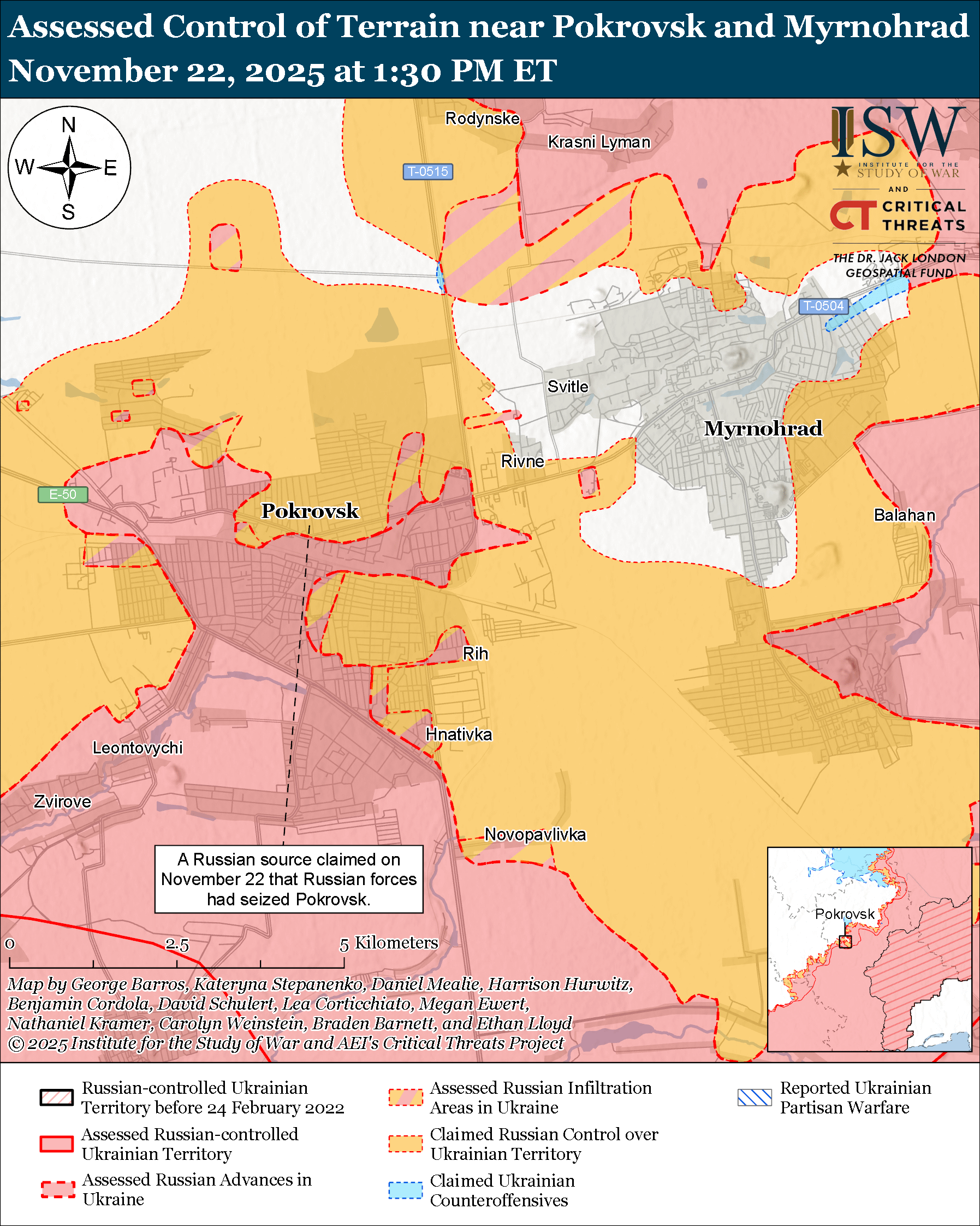 The situation in the Pokrovsk direction remains serious and dynamic as Russian forces continue attempts to seize Pokrovsk itself and encircle Ukrainian forces in Myrnohrad (east of Pokrovsk). Russian milbloggers claimed on November 21 and 22 that Russian forces seized Pokrovsk and advanced north of the town.[xv] Russian milbloggers also claimed that Russian forces advanced along the T-0504 Pokrovsk-Myrnohrad highway in southern Rivne (between Pokrovsk and Myrnohrad).[xvi] Russian sources claimed that Russian forces have begun attacking into Myrnohrad along the T-0504 from Rivne and advanced in eastern Myrnohrad, likely in an attempt to fix Ukrainian forces within Myrnohrad while also tightening the encirclement around Myrnohrad and blocking Ukrainian egress routes from the town.[xvii] A Ukrainian servicemember acknowledged on November 21 that Ukrainian forces "completely" lost Pokrovsk and noted that Russian forces are attempting to narrow the egress route near Myrnohrad and Rivne.[xviii] The servicemember further stated that Russian forces have cut off all logistics into Myrnohrad and that Ukrainian forces will likely be unable to withdraw from the remaining, limited opening in the pocket.