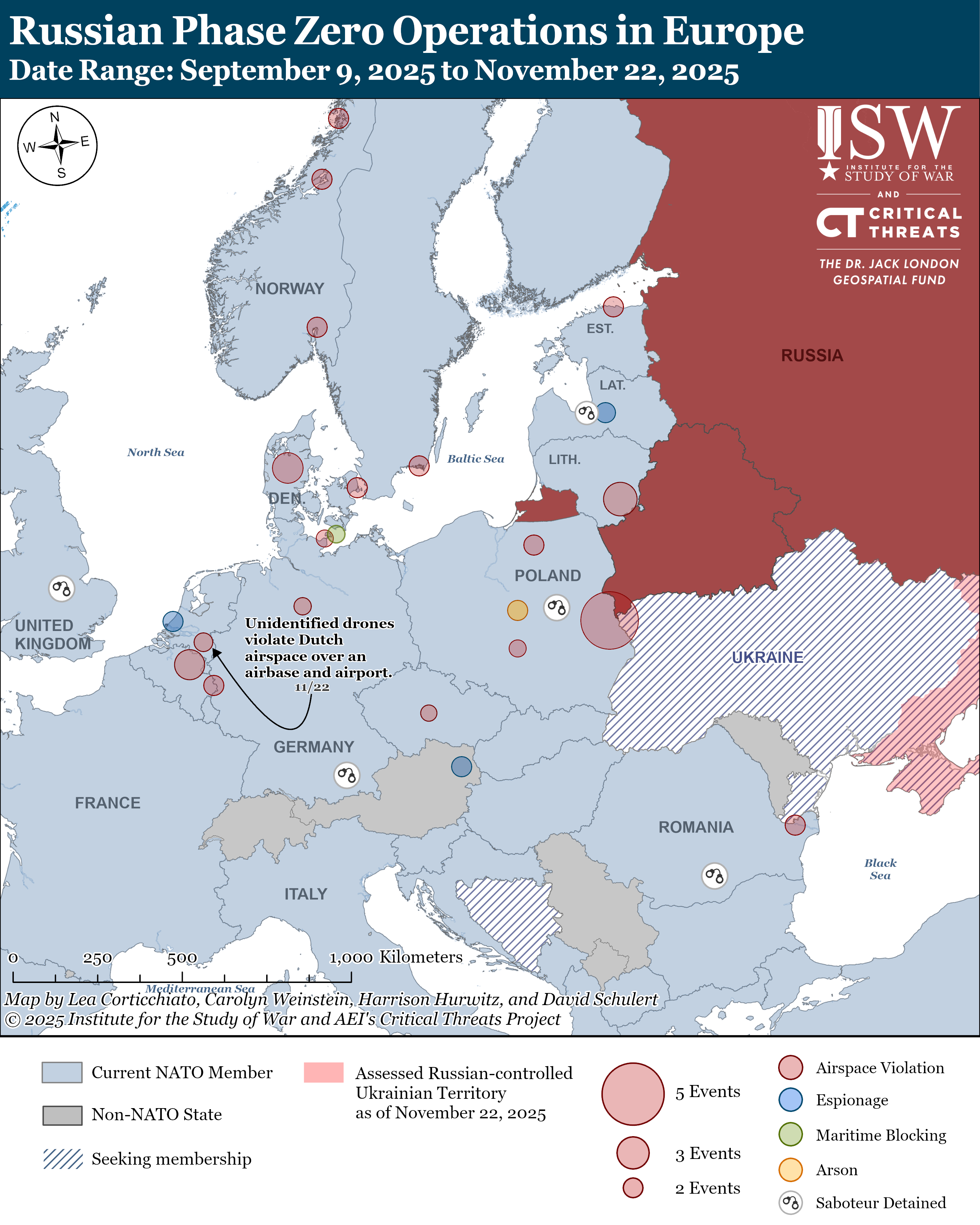 Authorities recently reported multiple drone sightings over air bases and airports in the Netherlands. Dutch Defense Minister Ruben Brekelmans reported that authorities observed unidentified drones flying over Volkel Air Base near Eindhoven, a Royal Netherlands Air Force base that hosts a US Air Force squadron as part of NATO, on the evening of November 21.[xxiv] Brekelmans reported that attempts to shoot down the drones were unsuccessful and that authorities never recovered the drones after they flew away. Brekelmans reported that authorities also observed multiple drones at Eindhoven Airport on November 22 and subsequently suspended civilian and military air traffic.[xxv] Dutch authorities have not identified an actor behind the drone overflights as of this writing. These are the latest in a series of drone sightings over European airports and air bases in recent weeks, which come against the backdrop of Russia’s intensifying “Phase Zero” campaign to destabilize Europe, undermine NATO’s cohesion, and set the political, informational, and psychological conditions for a potential future Russian war against NATO.[xxvi]