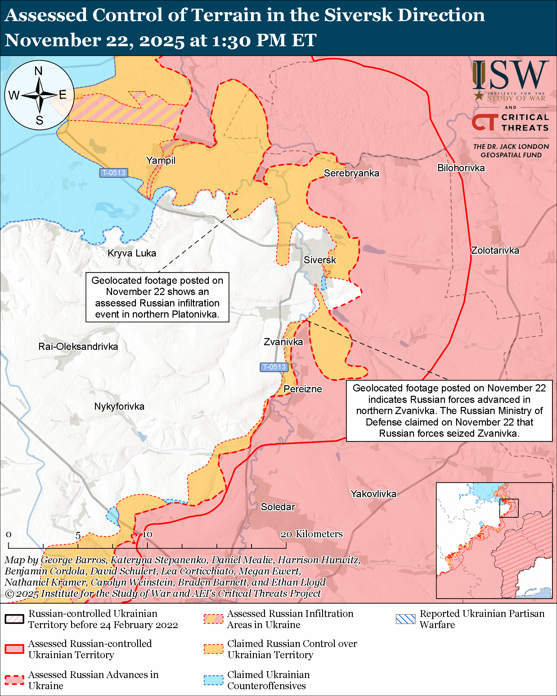 Assessed Russian infiltrations: Geolocated footage published on November 22 shows Ukrainian forces striking a Russian position along the T-0513 Lyman-Siversk highway south of Yampil (southeast of Lyman) after what ISW was a Russian infiltration mission that did not change control of terrain or the FEBA.[lxiv]